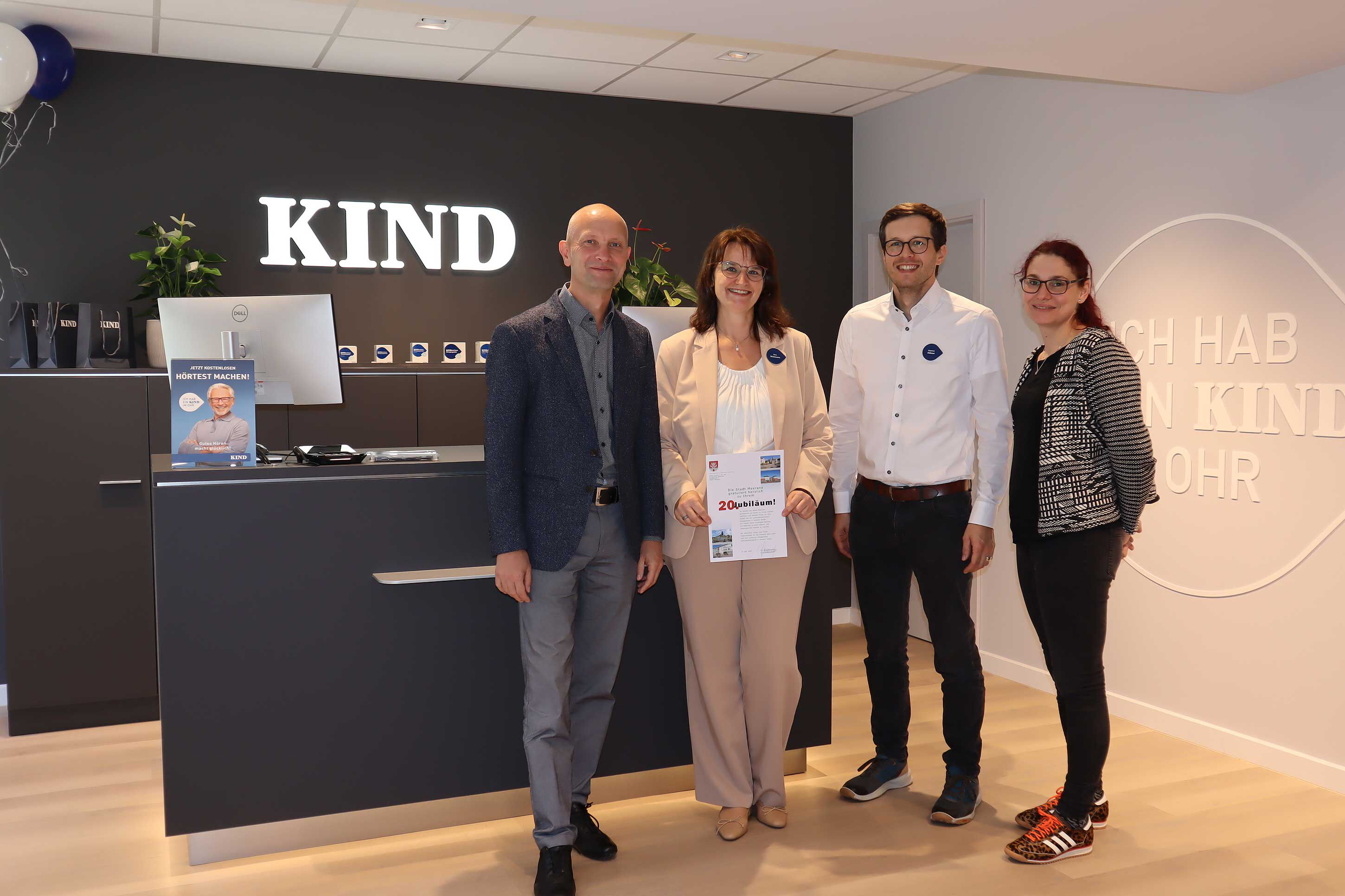 Seit 20 Jahren gibt es das Unternehmen KIND GmbH & Co.KG in Meerane. Die Geschäftsräume des Fachgeschäftes für Hörgeräte befinden sich in der Poststraße 7, zuerst im ersten Stock des Gebäudes, seit November 2024 im Erdgeschoss. Hier empfing Silke Wichmann, Hörakustikmeisterin und Fachgeschäftsleiterin, am 21. Oktober 2025 Bürgermeister Jörg Schmeißer anlässlich des 20-jährigen Firmenjubiläums. Bei einem kleinen Rundgang stellte sie die neuen Räumlichkeiten vor.