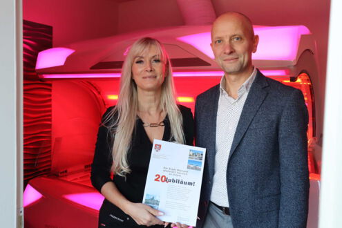 Vor 20 Jahren, im Dezember 2005, öffnete das Sonnenstudio Happy Sun in Meerane. Geschäftsführerin Monique Süß begrüßte anlässlich des Firmenjubiläums Anfang Dezember 2025 den Meeraner Bürgermeister Jörg Schmeißer in den Räumlichkeiten des Sonnenstudios in der Rudolf-Breitscheid-Straße 14. Jörg Schmeißer überbrachte ihr die Glückwünsche der Stadt Meerane und gratulierte ihr herzlich.