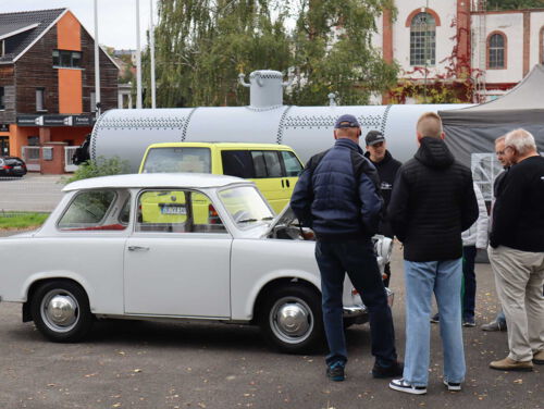 Thomas Müller vom Verein Inter Trab e.V. gemeinsam mit Trabant-Enthusiasten, die aus Berlin, Bitterfeld und Neuhaus nach Meerane angereist waren.