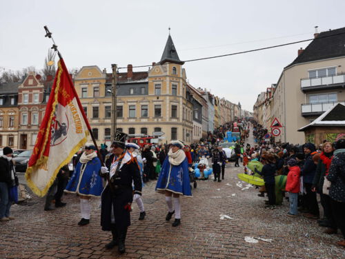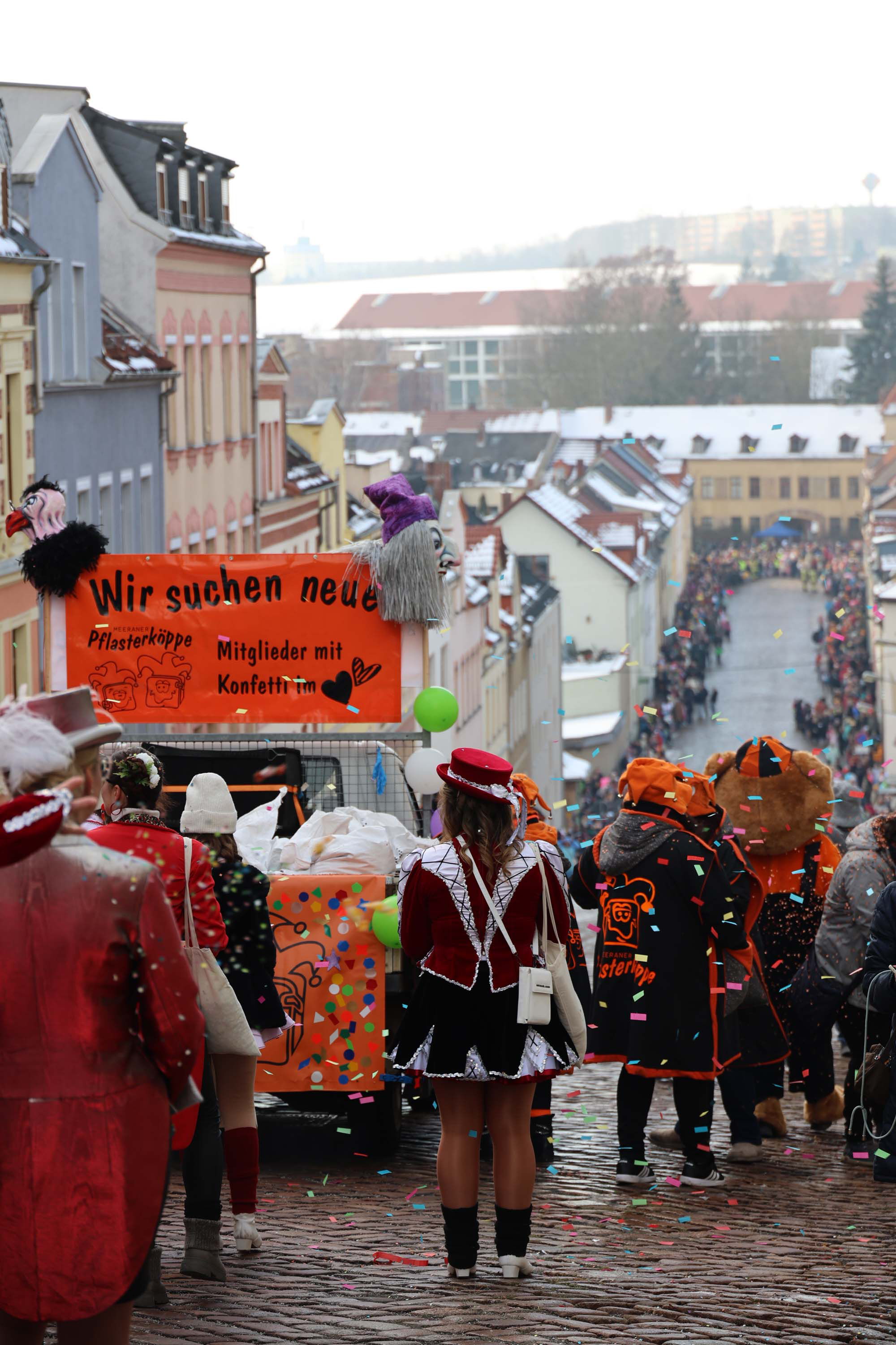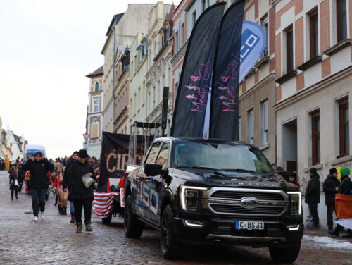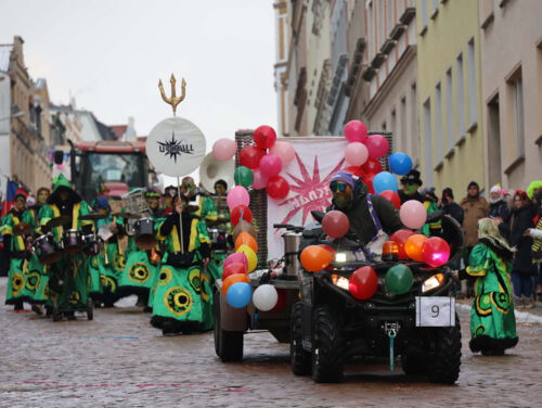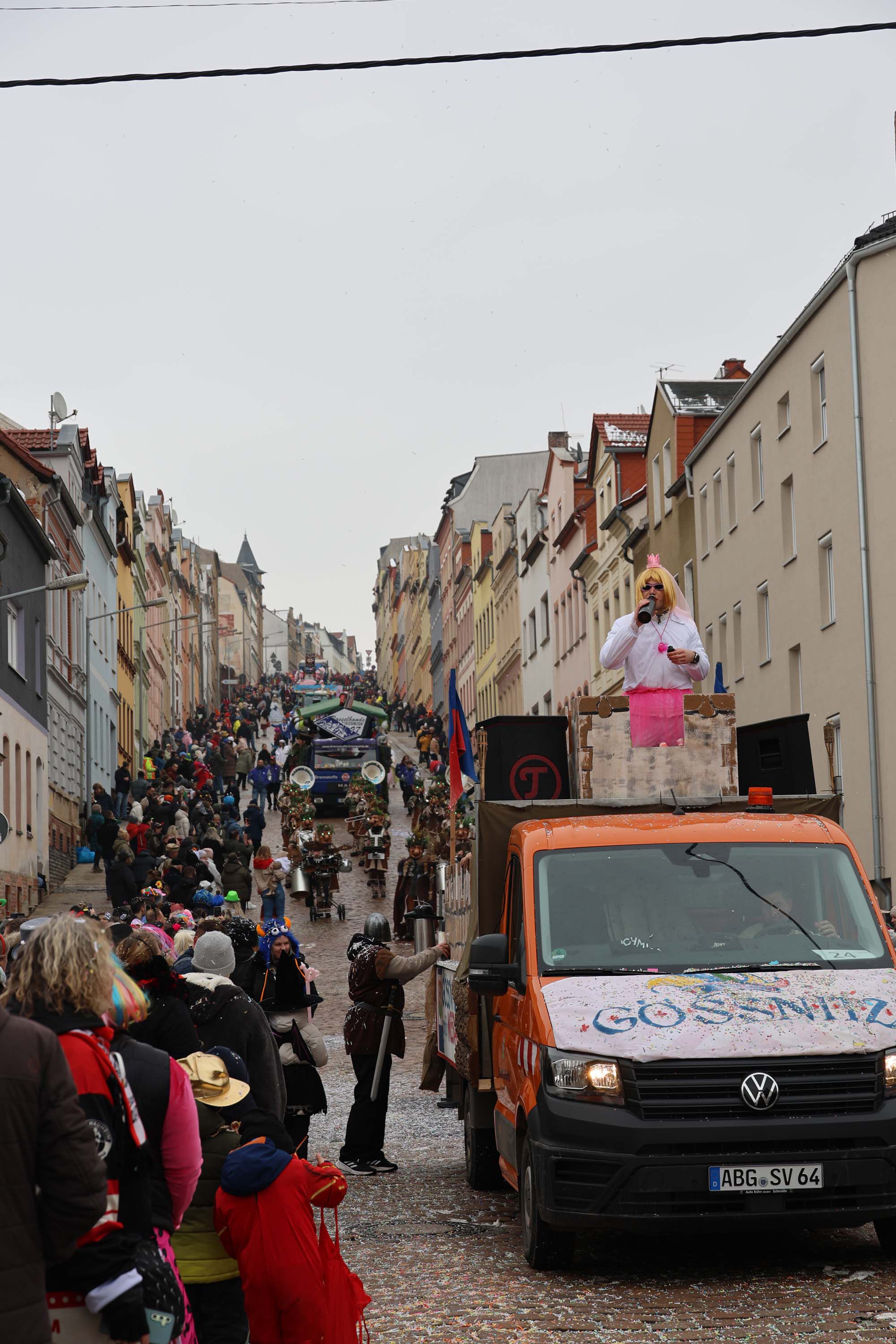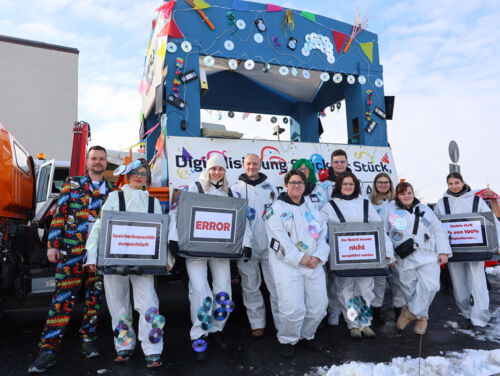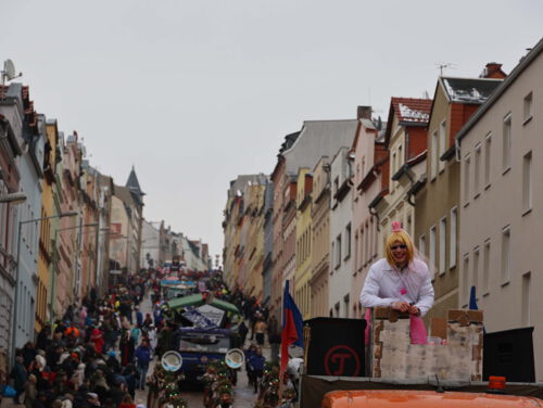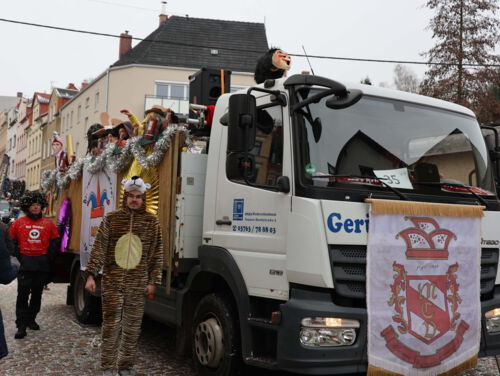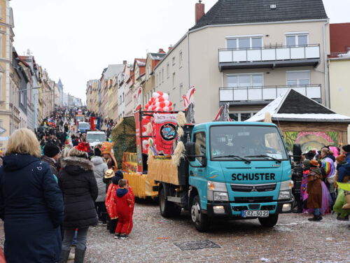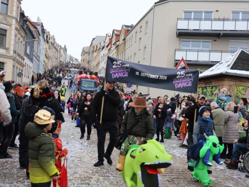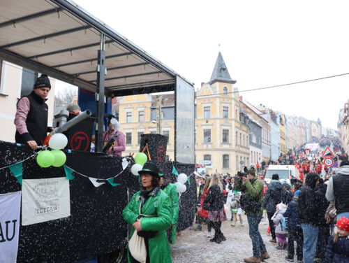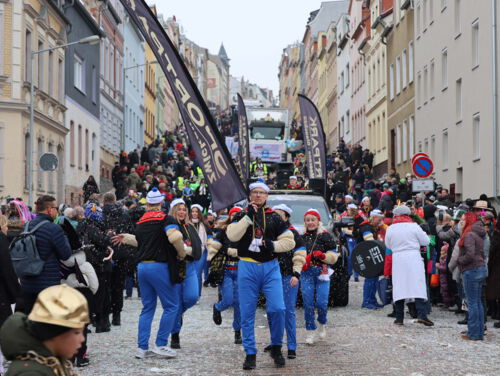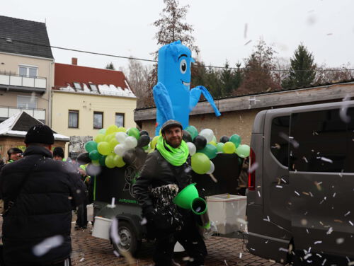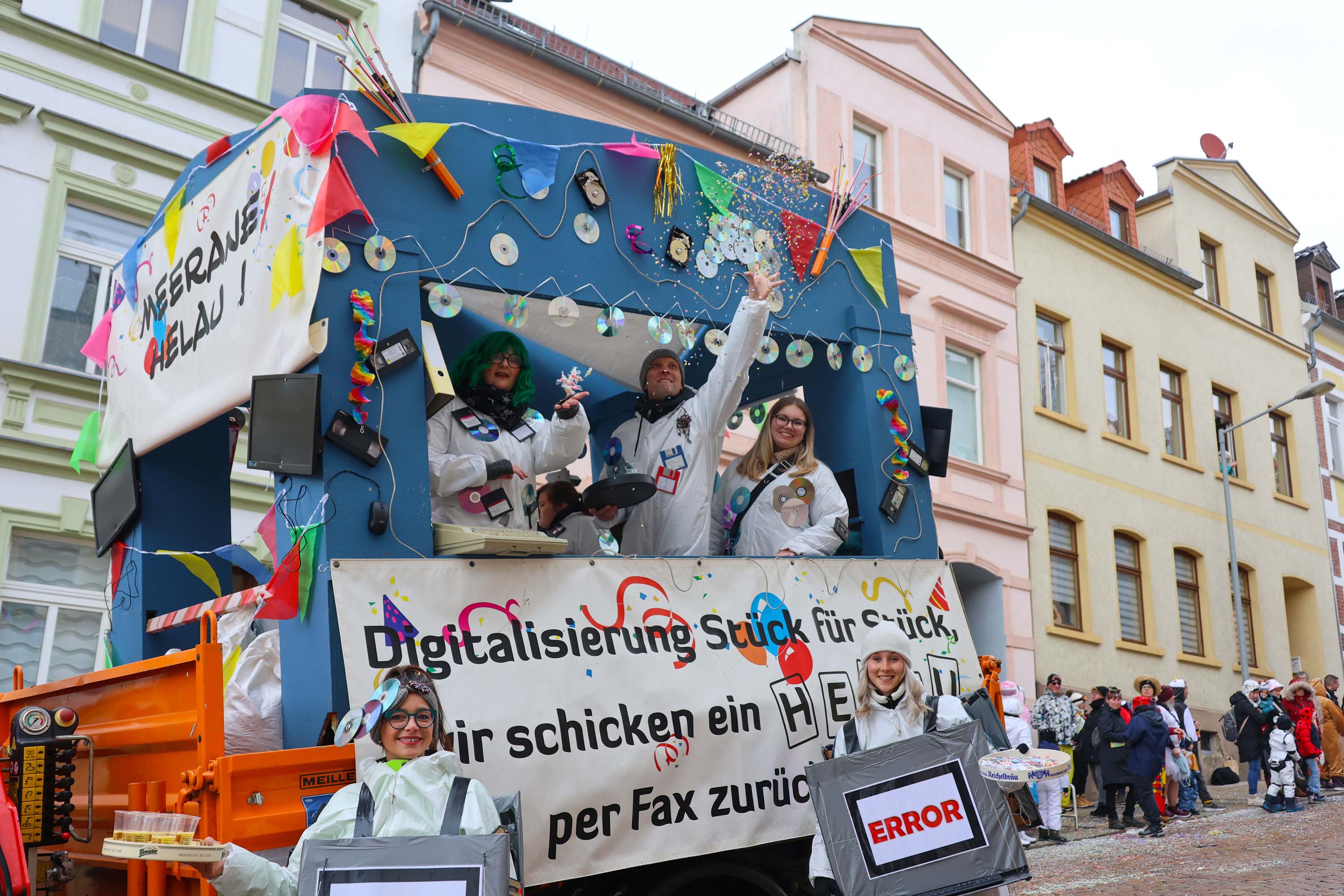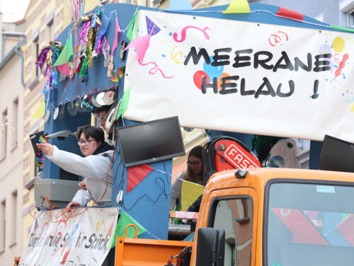 Mitten im Geschehen war auch Bürgermeister Jörg Schmeißer, der auf dem Umzugswagen der Stadt Meerane mitfuhr. Unter dem augenzwinkernden Motto „Digitalisierung Stück für Stück – wir schicken ein HELAU per Fax zurück!“ zeigte sich auch die Stadtverwaltung von ihrer närrischen Seite. Begeistert von der grandiosen Stimmung im Zug und entlang der Straßen dankte Jörg Schmeißer im Namen der Stadt Meerane allen Beteiligten – insbesondere den Organisatoren der Meeraner Pflasterköppe – herzlich für ihr großes Engagement.