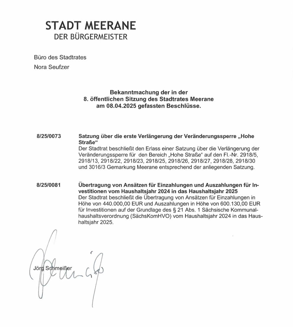 Bekanntmachung der in der Sitzung des Stadtrates Meerane am 08.04.2025 gefassten Beschlüsse