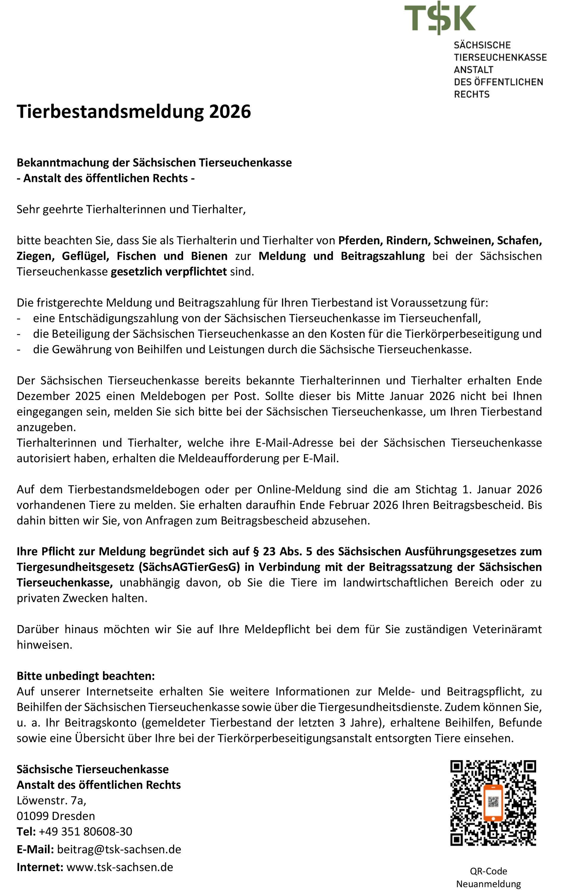Bekanntmachung der Sächsischen Tierseuchenkasse