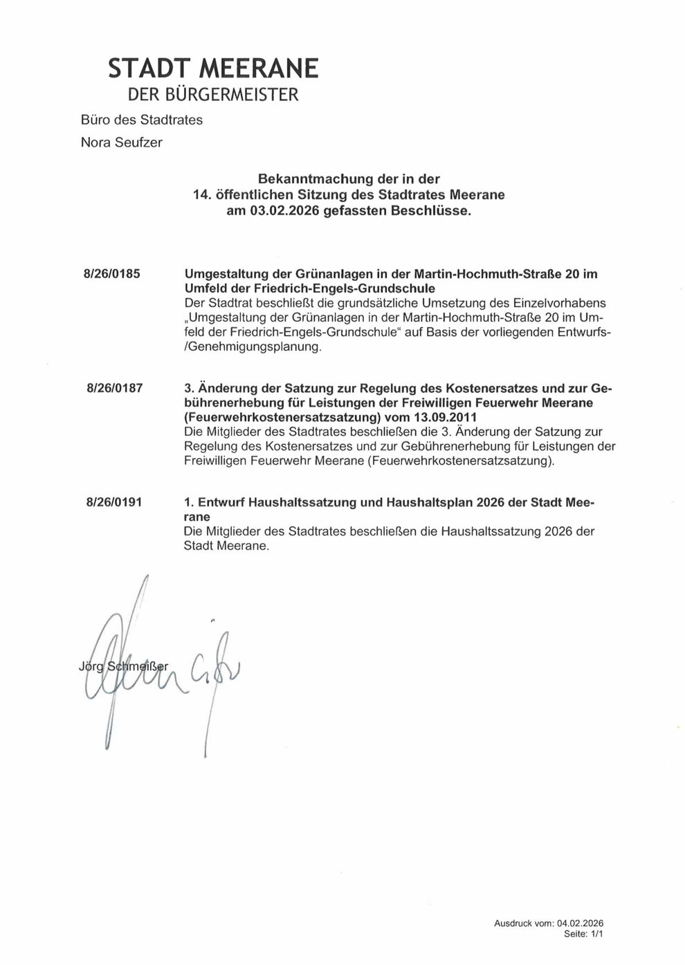 Bekanntmachung gefasster Beschlüsse aus der Sitzung des Stadtrates am 3. Februar 2026