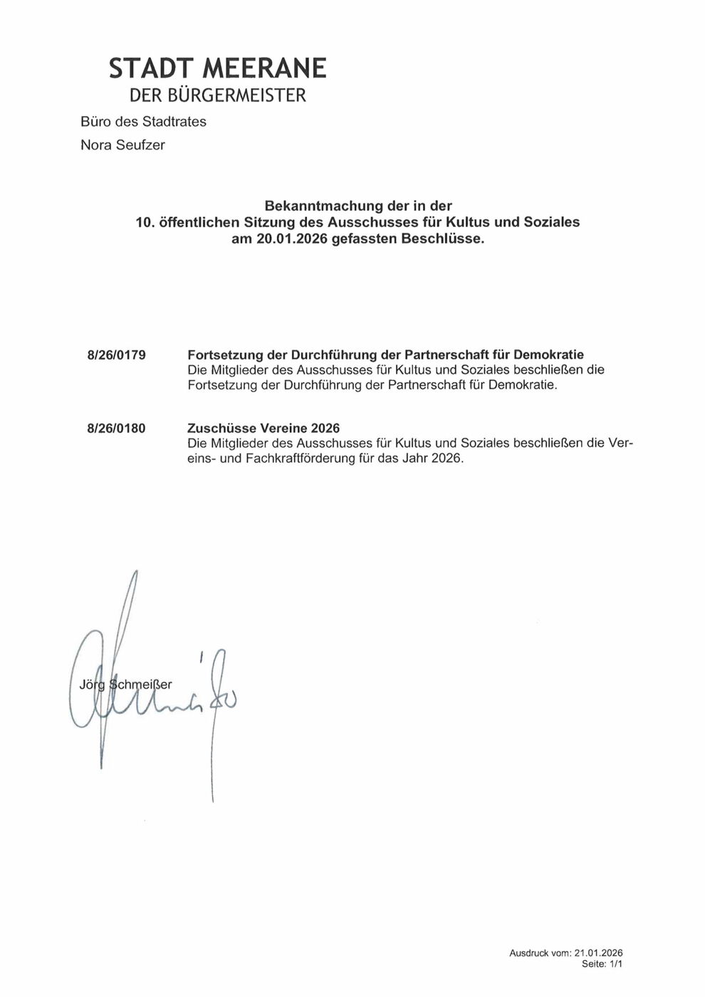 Bekanntmachung gefasster Beschlüsse aus der Sitzung des Verwaltungsausschusses am 20. Januar 2026