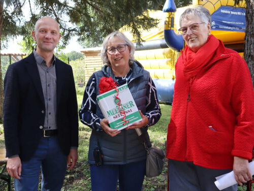 Zu den Gästen zählte auch Bürgermeister Jörg Schmeißer, der dem Organisationsteam um Eva Prochowski und Carmen Bauch die herzlichsten Grüße und Glückwünsche der Stadt Meerane aussprach und als Geschenk einen Karton Stadtjubiläums-Eierlikör überreichte. „Ich wünsche Ihnen und allen Gästen ein schönes Fest. Dass sich so viele Crotenlaider für das Jubiläum engagiert haben zeigt, wie gut sie hier zu einer Gemeinschaft zusammen gewachsen sind“, sagte er.