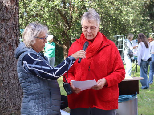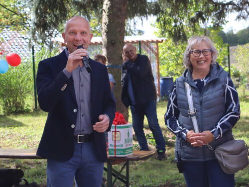 Eva Prochowski eröffnete um 14:00 Uhr das Fest, begrüßte herzlich alle Gäste, gab einen kurzen geschichtlichen Rückblick und bedankte sich bei allen, die ihre Grundstücke zum Jubiläum geschmückt hatten, beim Organisationsteam und allen Helferinnen und Helfern für das Engagement, bei allen Sponsoren und Spendern und der Guggemusik Rasselbande, die ihr Vereinsgelände zur Verfügung stellten. Mitgewirkt im Organisationsteam hatten die Familien Bauch, Distler, Flachs, Horn-Tröger, Krätschmar, Müller, Plechac, Prochowski, Reinboth, Richter, Sachs und Schmidt.
