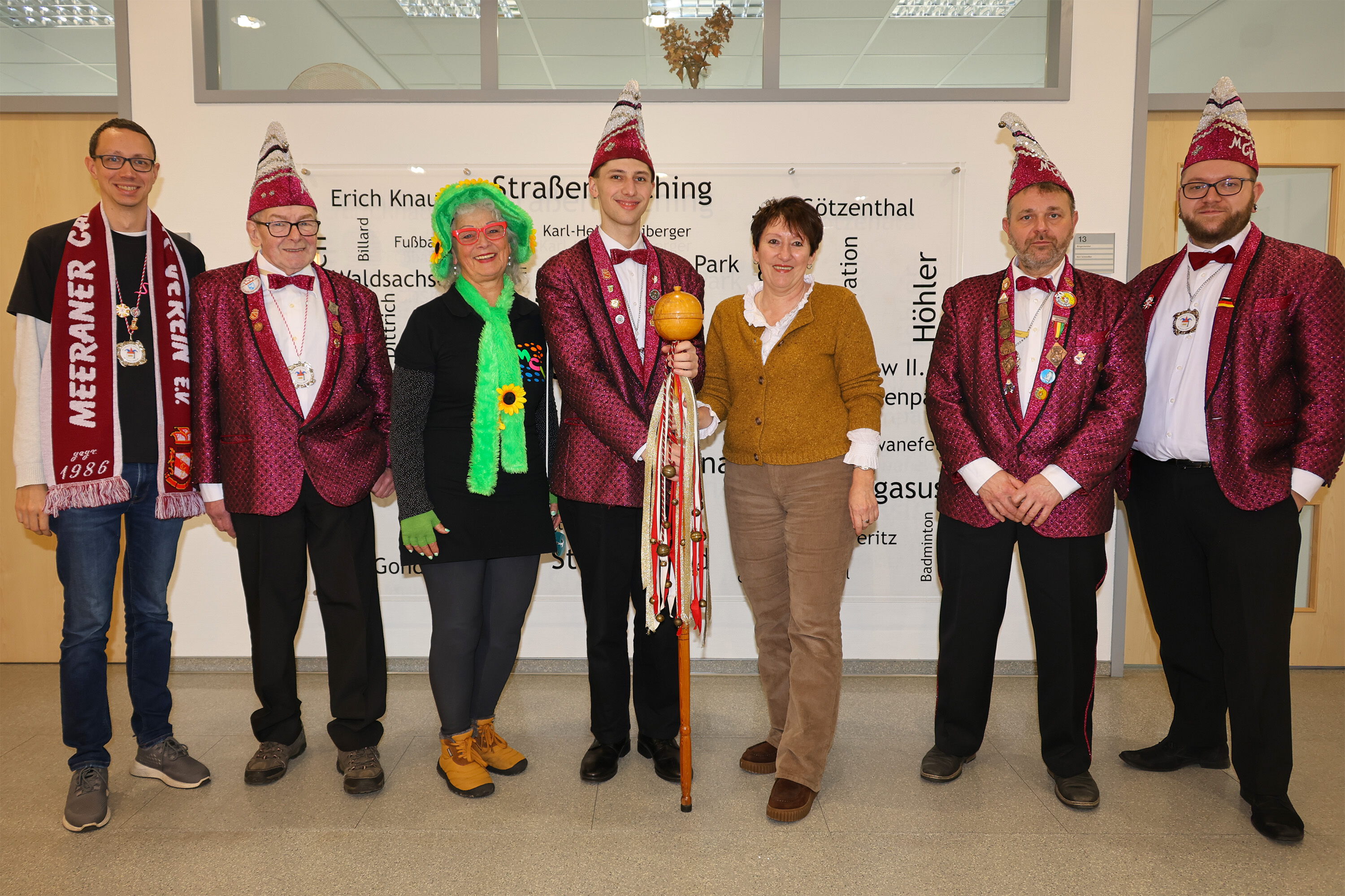 „Meerane Helau“ hieß es am heutigen Aschermittwoch in der Stadtverwaltung Meerane, als die Delegation des Meeraner Carnevals Vereins das Faschingszepter wieder ins Neue Rathaus brachte. Am 11.11.2025 hatten der MCV, die Meeraner Pflasterköppe, die Meeta-Girls und die Meeraner Nachtwächter das Zepter entgegengenommen und damit die Faschingszeit eingeläutet, die nun traditionell beendet wurde.