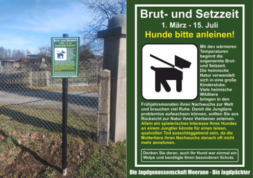 Laut Bundesjagdgesetz § 22 dürfen in den Setz- und Brutzeiten bis zum Selbständigwerden der Jungtiere die für die Aufzucht notwendigen Elterntiere, auch die von Wild ohne Schonzeit, nicht bejagt werden. Dies betrifft den Zeitraum vom 1. März bis 15. Juli. Dementsprechend haben in dieser Zeit auch die Tierhalter die Schonzeit zu beachten, indem sie ihre Tiere an der Leine führen und besondere Aufmerksamkeit walten lassen. Die Pächtergemeinschaft Meerane hat entsprechende Hinweisschilder angebracht, die auf die Schonzeit hinweisen. Leider ist es bereits zu Sachbeschädigungen der Schilder gekommen. Die Stadt Meerane und die Pächtergemeinschaft Meerane möchten daher darauf hinweisen, dass die Informationstafeln nicht zu beschädigen oder abzunehmen sowie ausdrücklich an das Verantwortungsbewusstsein der Tierhalter im Hinblick auf die Berücksichtigung der Schonzeit appellieren!