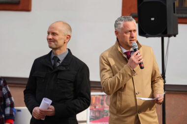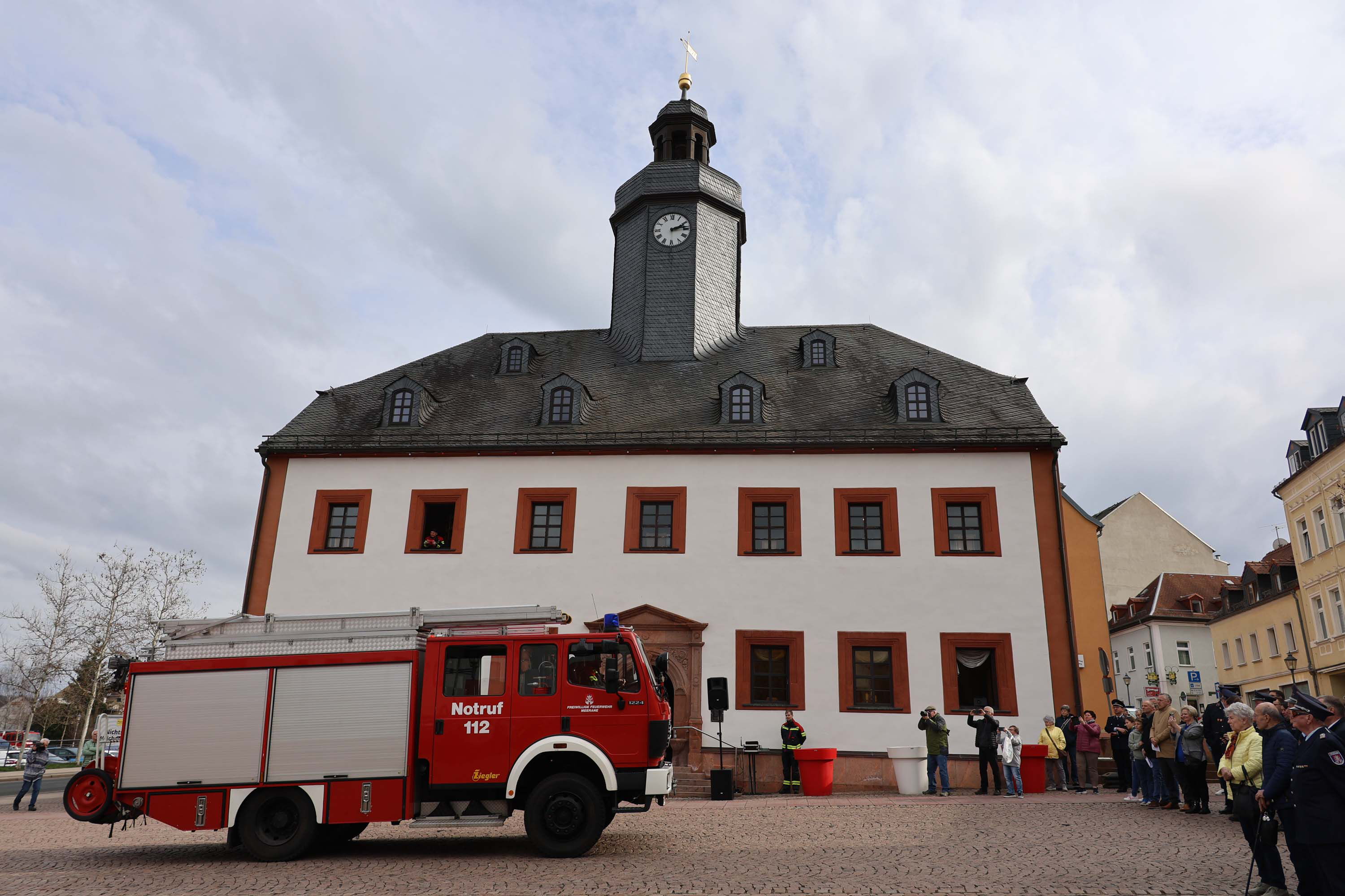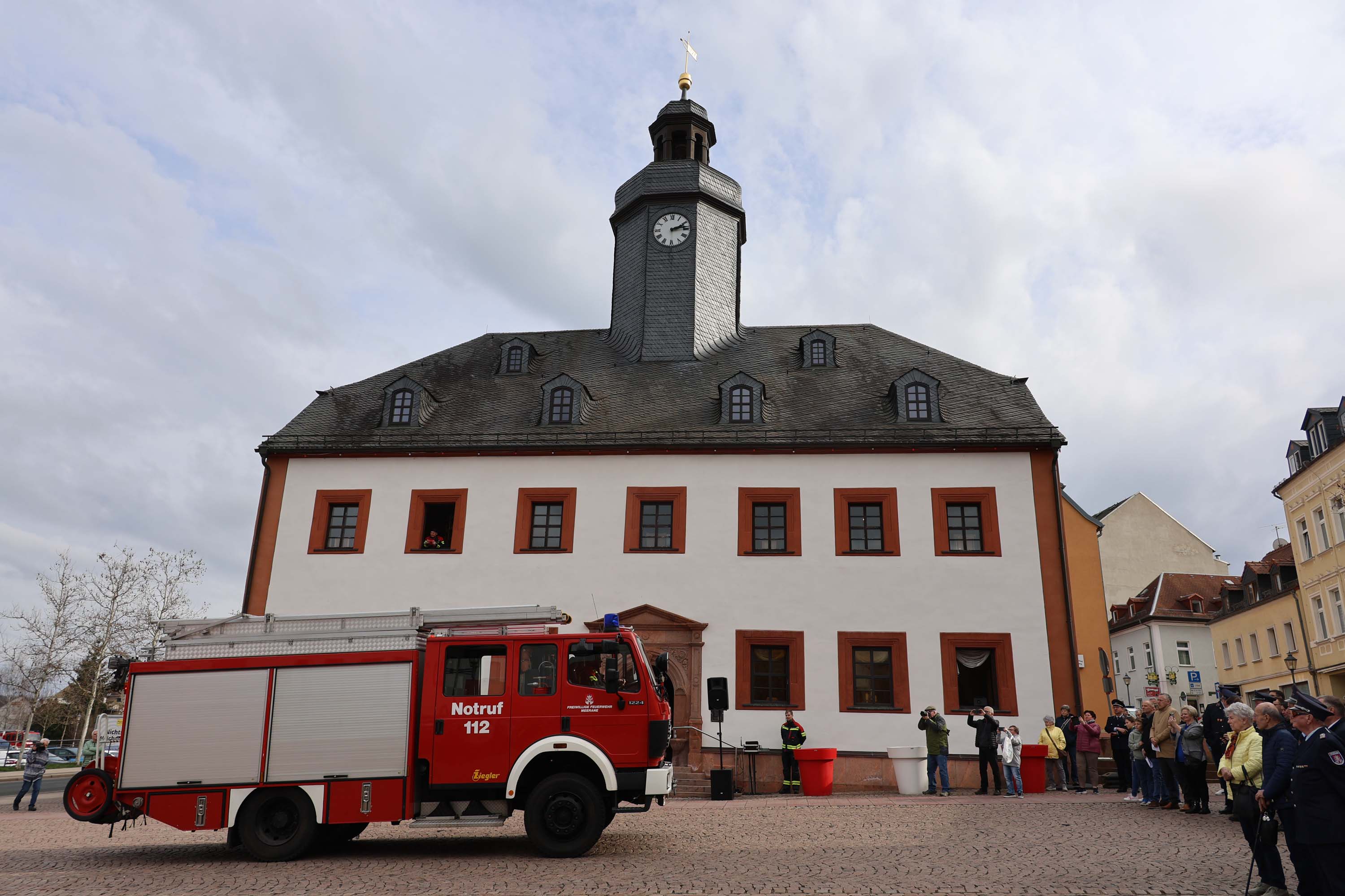 Wehrleiter Kai Götze hieß neben den vielen großen und kleinen Gästen auch Bürgermeister Jörg Schmeißer, Landrat Carsten Michaelis, die Landtagsabgeordnete Daniela Pfeifer, den Landtagsabgeordneten Andreas Gerold, Meeraner Stadträte, die Dezernentin Iris Anders sowie Wehrleiter und Kameraden aus den umliegenden Gemeinden herzlich willkommen. „Es ist eine besondere Veranstaltung“, betonte Kai Götze. Die letzte Fahrzeugvorstellung dieser Art auf dem Meeraner Markt hatte im September 1979 stattgefunden. „Es war damals die erste Fahrzeugübergabe, die ich miterlebt habe“, erinnerte sich der Wehrleiter. Die Freude ist groß, dass so viele Gäste den Weg auf den Markt gefunden haben. „Wir wollen zeigen, wofür die Stadt Meerane Geld investiert – für die Sicherheit der Einwohner.“