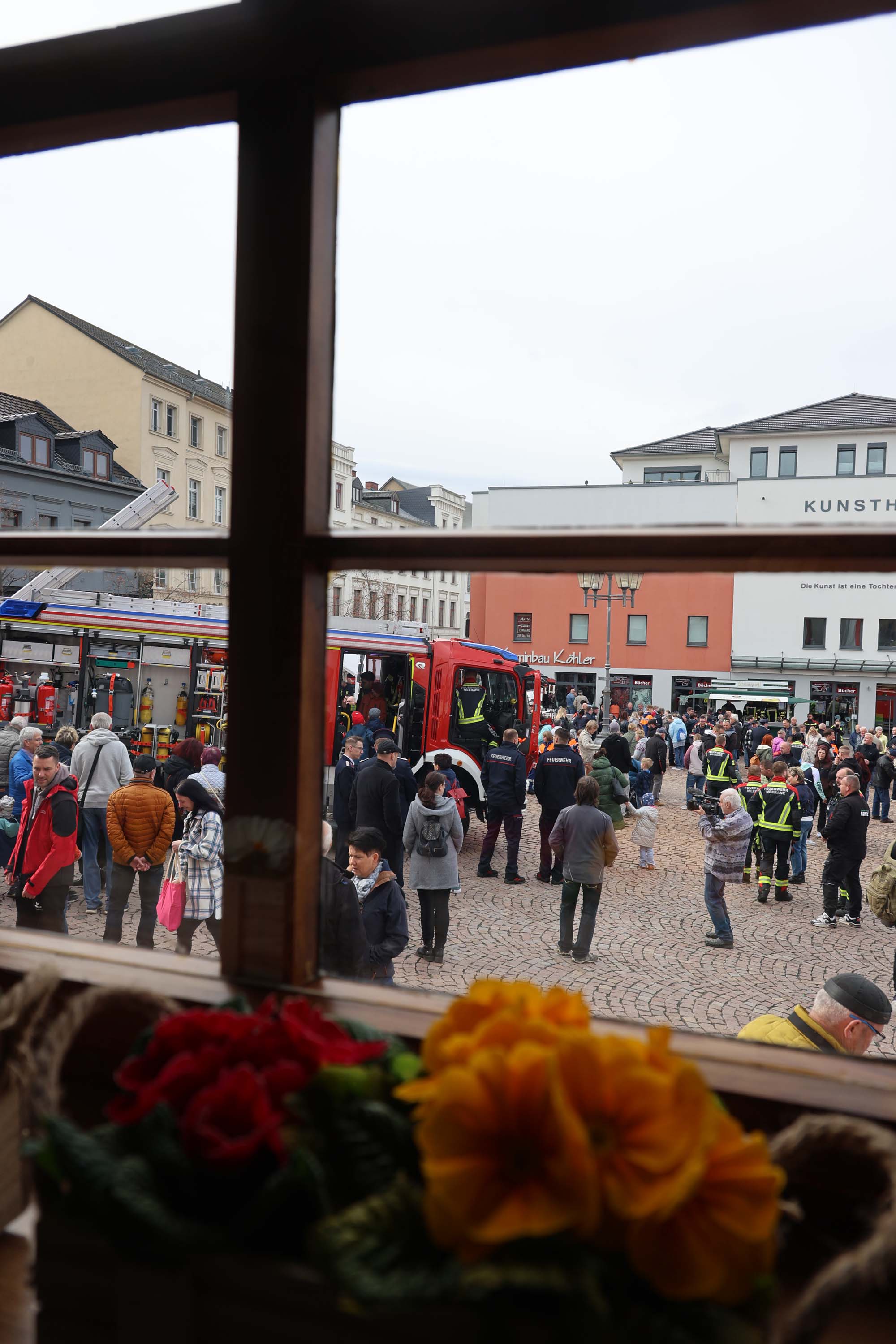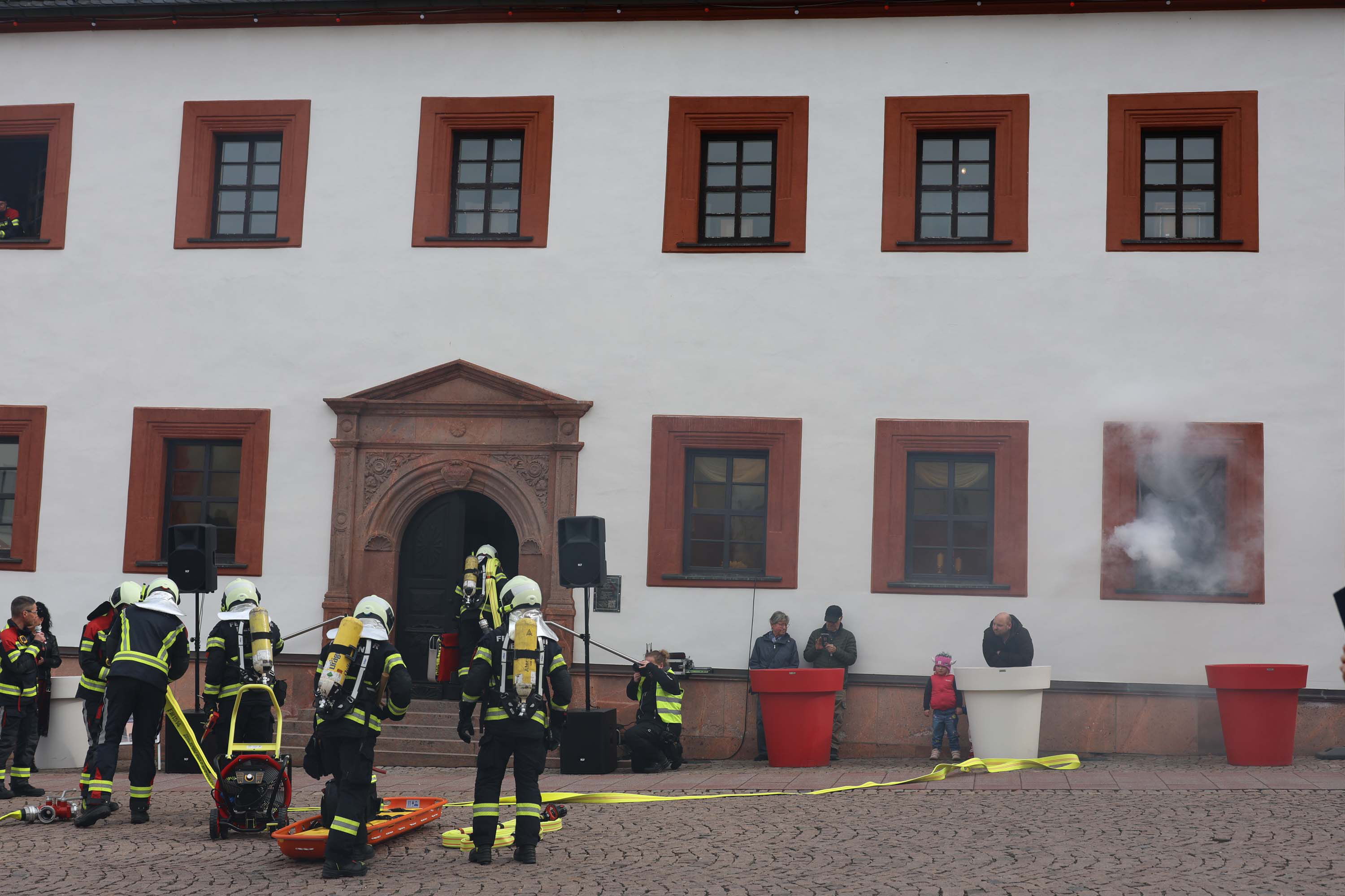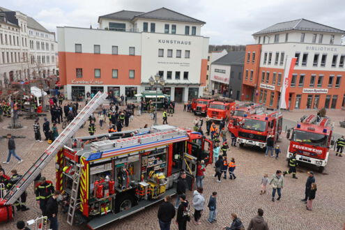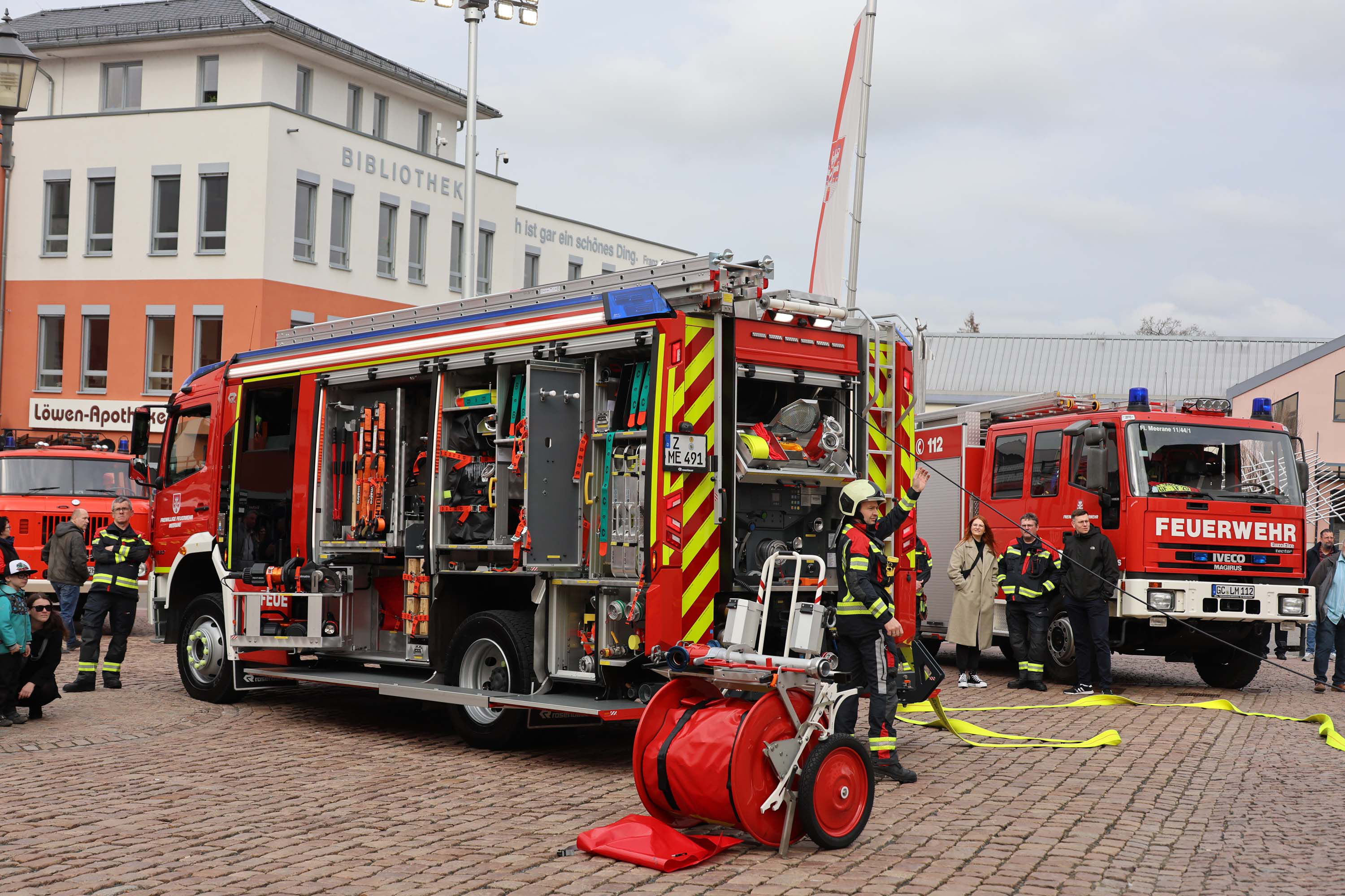 Anschließend war es soweit: Das neue HLF 20 rollte zur Schauübung auf den Markt. Simuliert wurde eine Brandbekämpfung am Alten Rathaus. Während Kai Götze die technischen Details und die umfangreiche Ausstattung des Fahrzeugs erläuterte, begannen die Kameraden mit den Vorbereitungen für den Einsatz und brachten die benötigten Geräte in Stellung. „Das HLF 20 hat eine Vielzahl von Gerätschaften an Bord und ist für nahezu alle Einsatzlagen gerüstet“, erklärte der Wehrleiter.