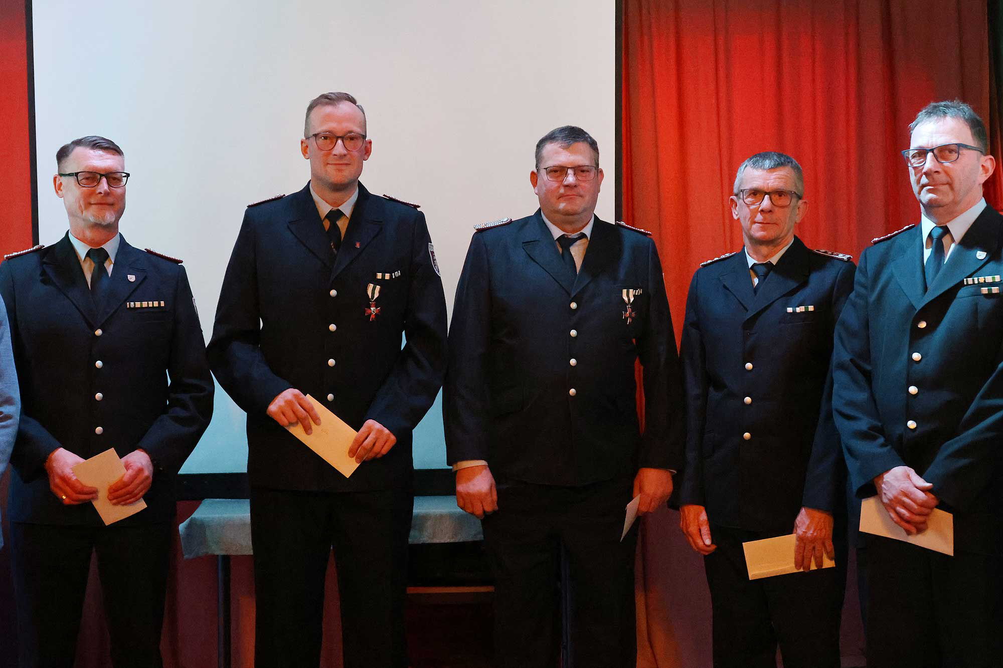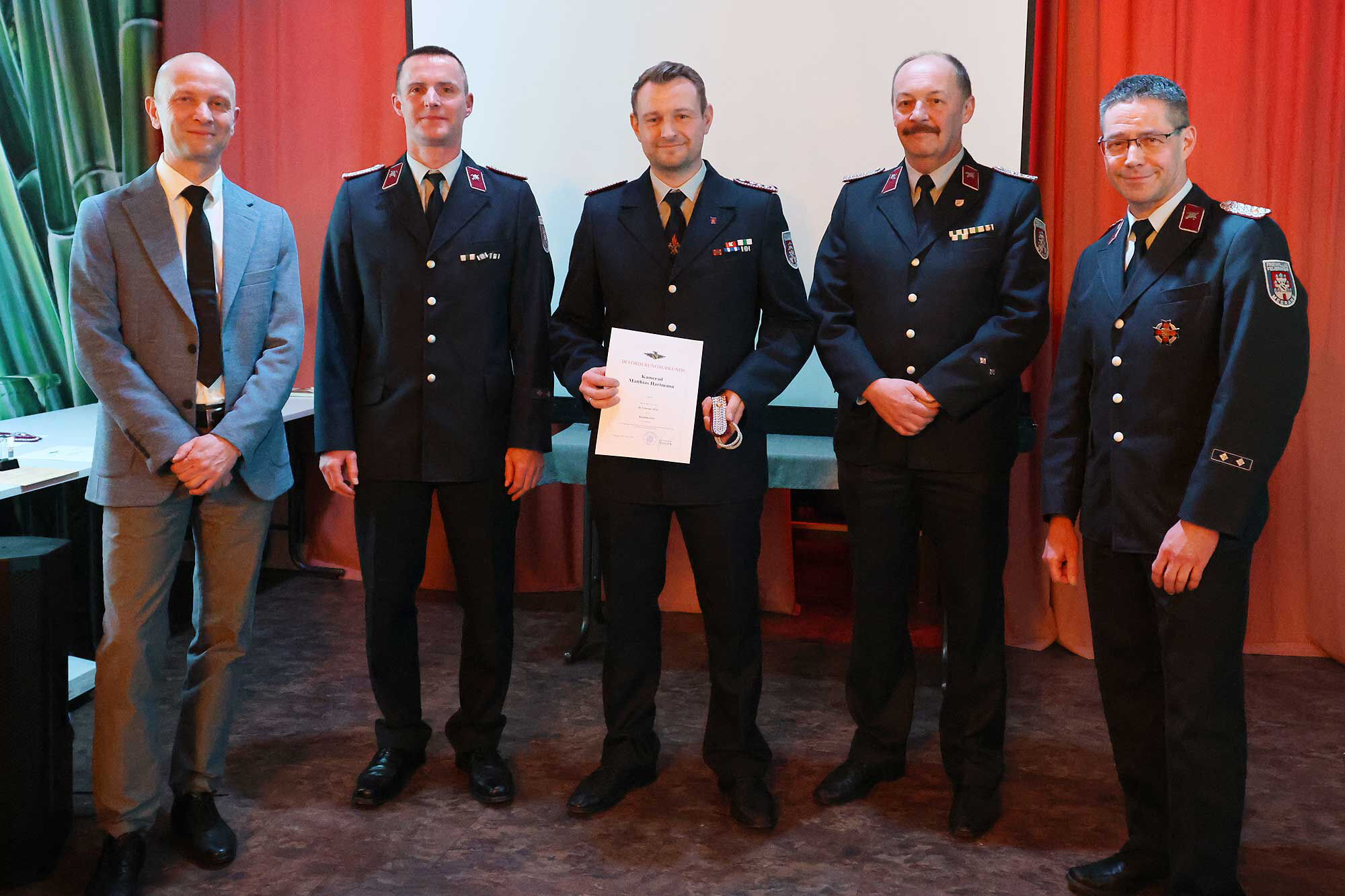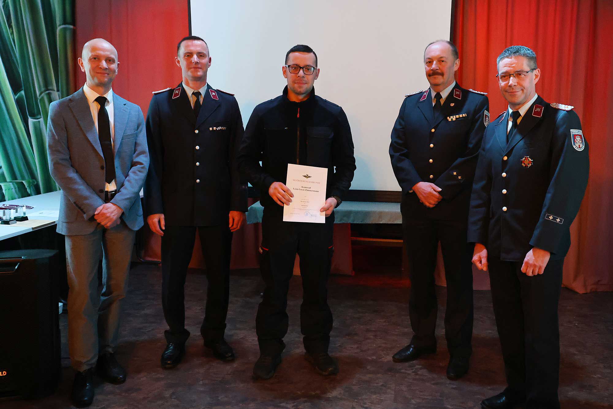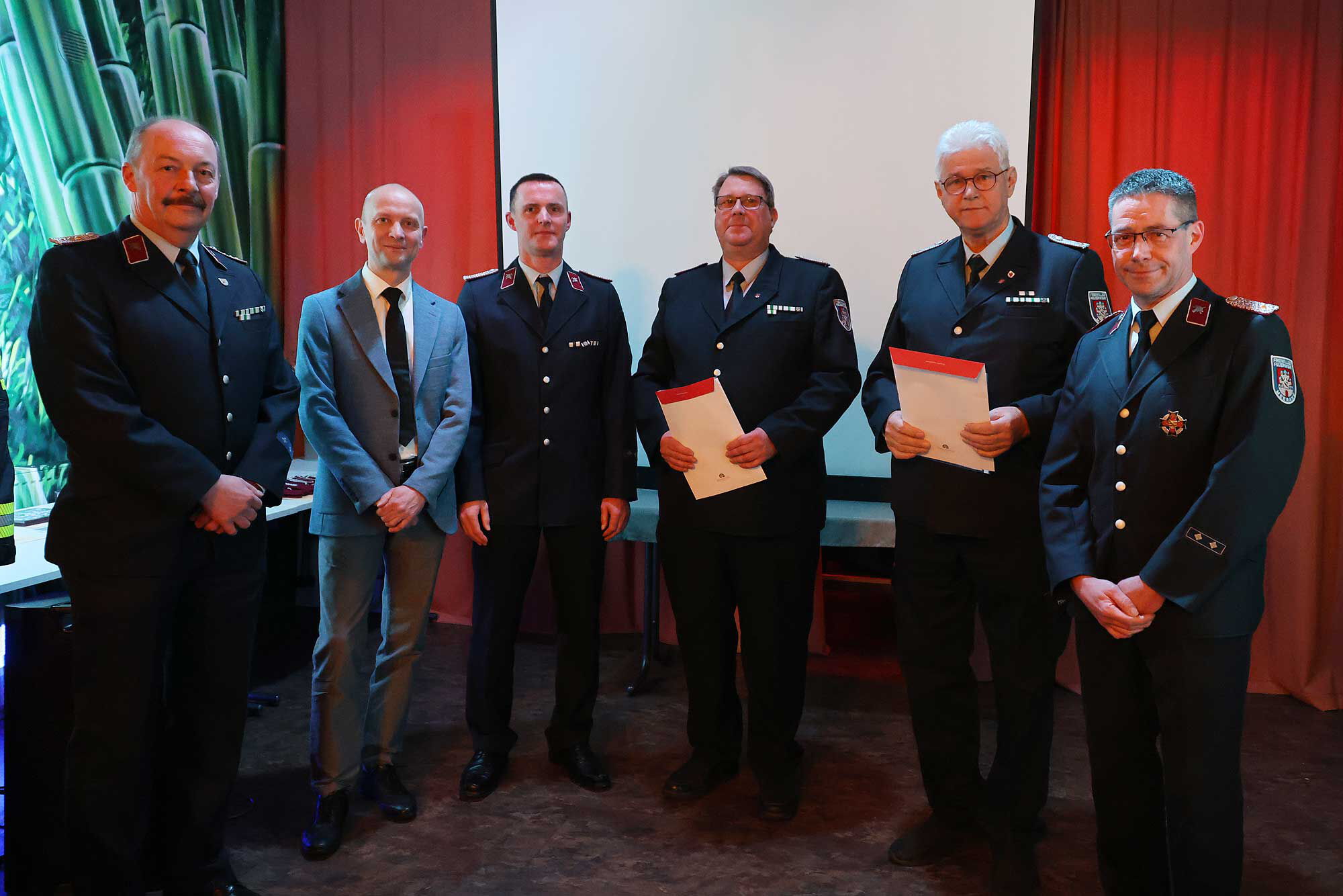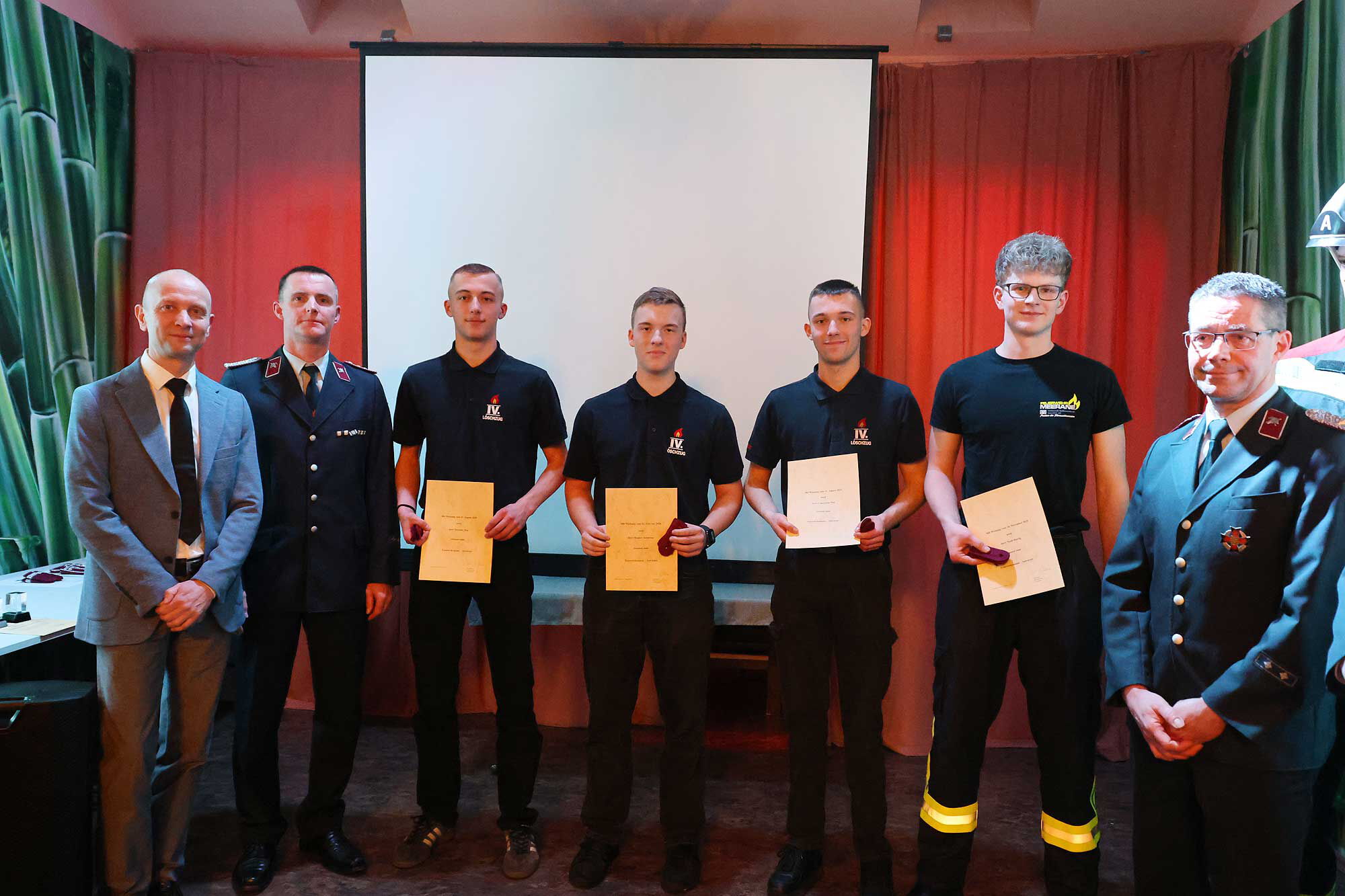 Die Urkunden überreichten Wehrleiter Kai Götze und seine Stellvertreter Jörg Scheerer und Sven Hertwig gemeinsam mit Bürgermeister Jörg Schmeißer, verbunden mit herzlichen Glückwünschen.