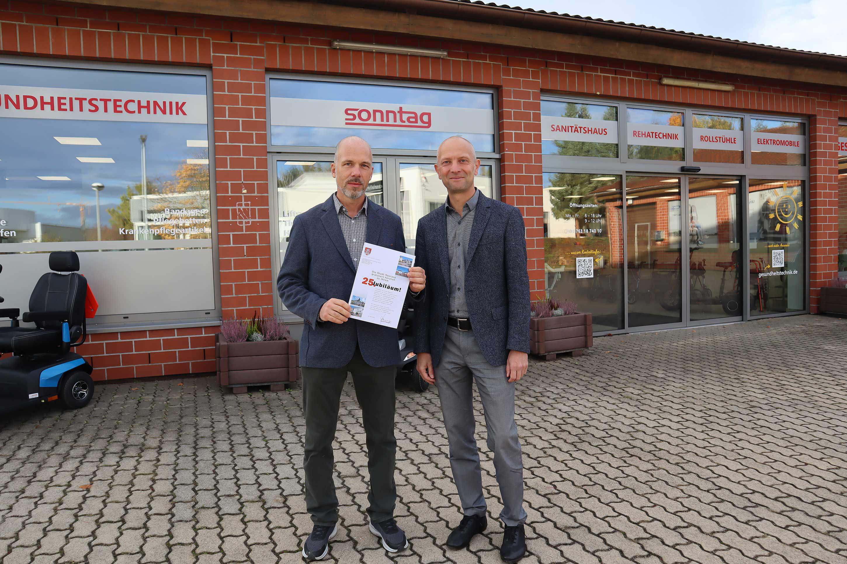 Anlässlich des Firmenjubiläums besuchte Bürgermeister Jörg Schmeißer im Oktober 2025 das Unternehmen. Im Gespräch mit Geschäftsführer Uwe Sonntag, Teamleiterin Katja Wagner und Meister Lutz Tank informierten diese über die Gründung und Entwicklung des Sanitätshauses und über das Leistungsspektrum und die umfangreichen Angebote für Patienten und Kunden.