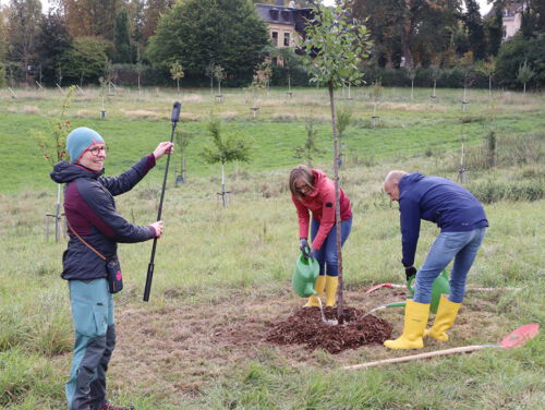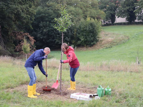 Die Mitarbeiter der Meeraner Stadttechnik hatten in Brumms Grund schon alles für die Pflanzung an diesem Vormittag vorbereitet, so dass Bürgermeister Jörg Schmeißer und Sabine Schumann zur Tat schreiten konnten. Gepflanzt haben sie ein Pflaumenbäumchen und Katja Eidam und Alexandra Jost vom Team Öffentlichkeitsarbeit haben diesen Termin für Social Media begleitet. Denn der Bürgermeister konnte seinerseits drei Nominierungen für die Baumpflanz-Challenge vornehmen. Von der Stadt Meerane nominiert wurden Patrick Kühni, der Geschäftsführer der Stadtwerke Meerane GmbH, Marko Würker, der Geschäftsführer der Städtischen Wohnungsbau- und Verwaltungsgesellschaft, und der Vorstand der Westsächsischen Wohnbaugenossenschaft Meerane Jürgen Morgner.
