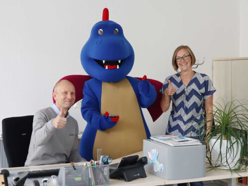 Unser Meeraner Stadtmaskottchen, der inzwischen gut bekannte Drache Meerano, kam am 24. September 2025 wieder einmal ins Neuen Rathaus Meerane. Er wollte aber nicht einfach nur mal „Hallo“ sagen, sondern lief schnurstracks ins Büro des Bürgermeisters und hielt Jörg Schmeißer ein Handy unter die Nase, auf dem ein Video lief. Der Bürgermeister rätselte, was Meerano wohl von ihm wollte, als die Dezernentin Bauwesen und Umwelt dazu kam und gleich wusste, worum es sich dreht: Die Stadt Meerane war von der Sparkasse Chemnitz für die Baumpflanz-Challenge, eine Social Media Aktion, nominiert worden und dieses Video wollte Meerano dem Bürgermeister unbedingt zeigen. „Na Meerano, du hast ja das Video zur Nominierung auch schon gesehen“, sagte Sabine Schumann und erklärte: „Na klar machen wir hier mit. Wir pflanzen einen Baum und leisten unseren Beitrag zum Umweltschutz!“