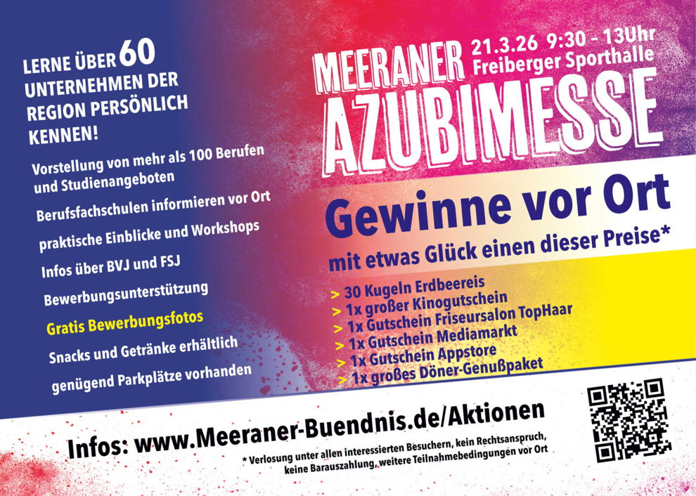 Die dritte Meeraner Ausbildungsmesse, veranstaltet vom Meeraner Bündnis e.V., findet am 21. März 2026 von 09:30 bis 13:00 Uhr in der Karl-Heinz-Freiberger-Sporthalle, Zum Erlengrund 7, statt. Unter dem Motto „DEINE ZUKUNFT JETZT!“ sind alle Schülerinnen und Schüler aus Meerane und den umliegenden Städten und Gemeinden mit ihren Familien herzlich eingeladen. Mit dabei sind über 60 Unternehmen und Bildungsträger der Region, die mehr als 100 Berufe und Studienangebote vorstellen und praktische Einblicke sowie Workshops anbieten. Außerdem gibt es attraktive Preise zu gewinnen!