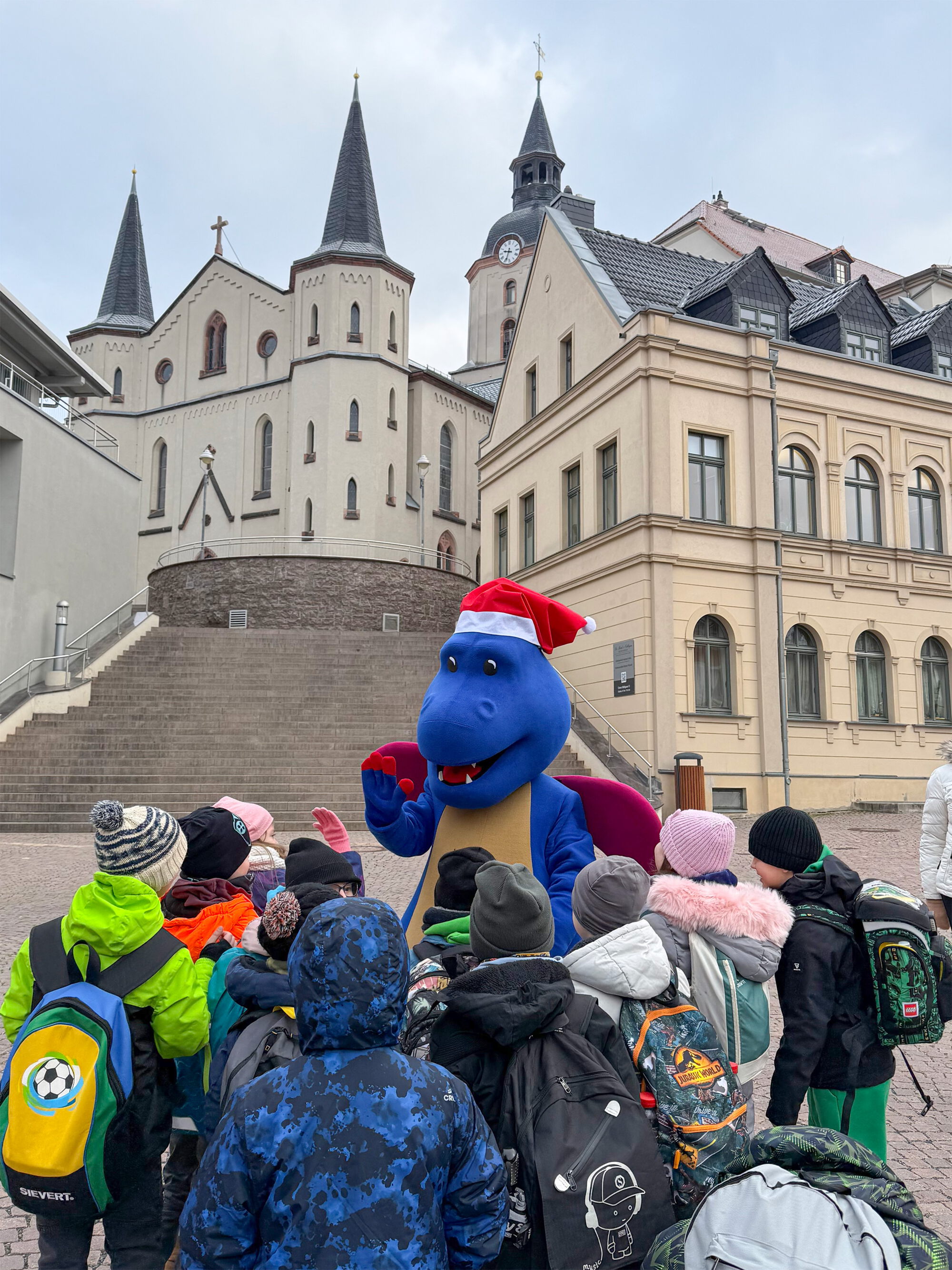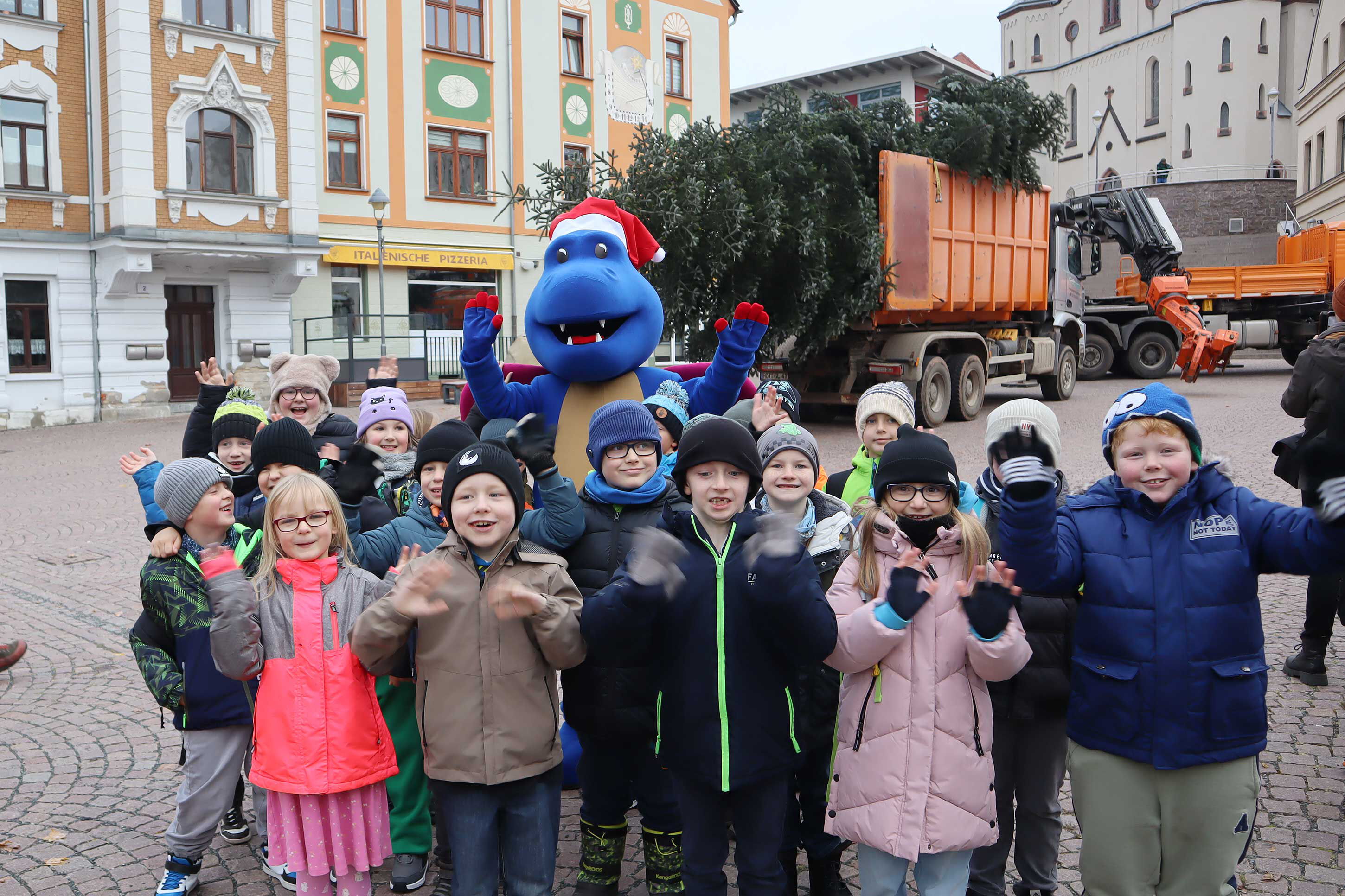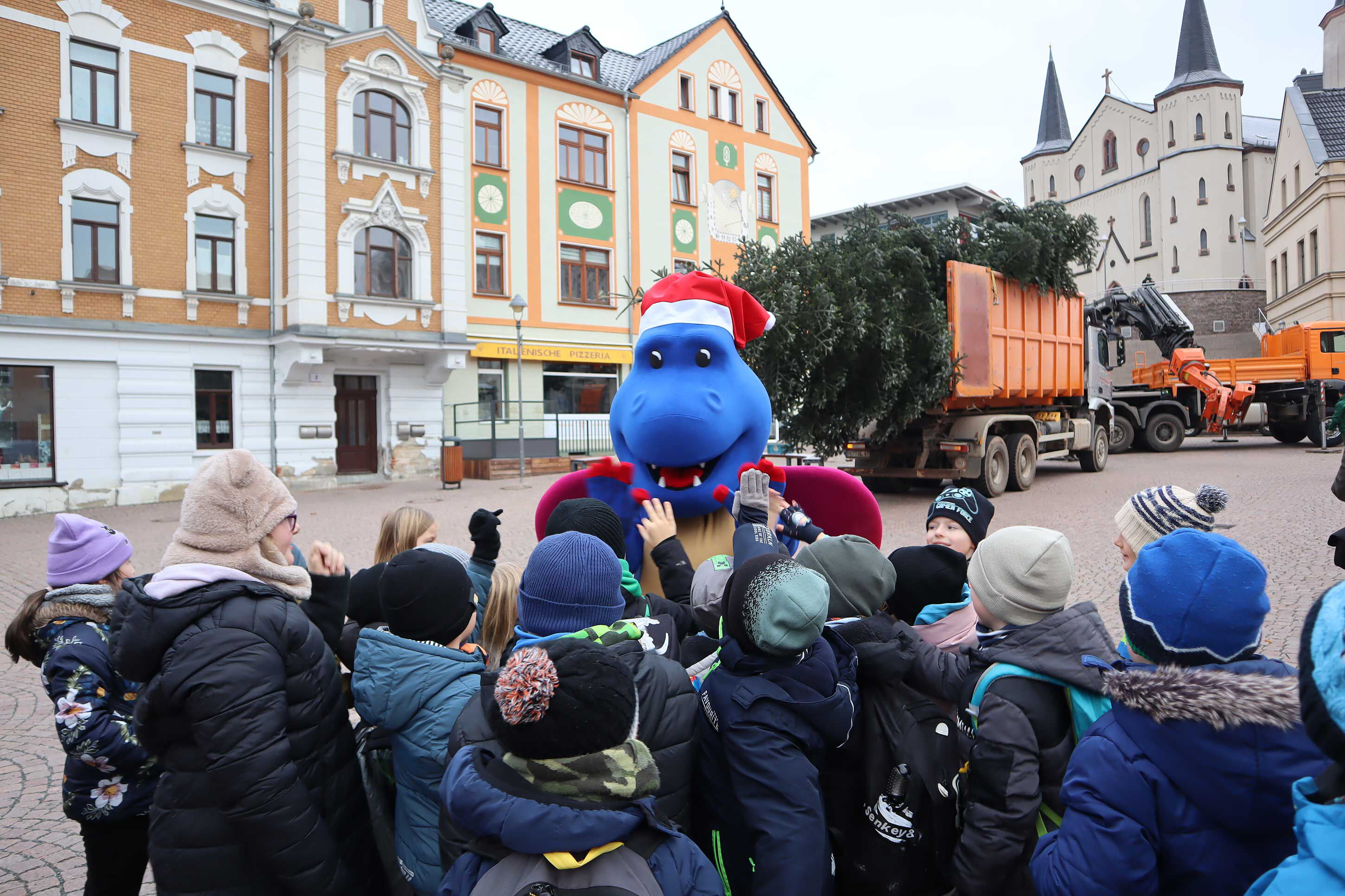 Große Aufregung heute Vormittag auf dem Meeraner Teichplatz: Der Weihnachtsbaum wurde aufgestellt und das durfte natürlich auch unser Stadtmaskottchen Meerano nicht verpassen! Mit ihm gemeinsam haben die Mädchen und Jungen aus den 2. Klassen der Grundschule Friedrich-Engels-Schule gestaunt, die auf ihrem Weg vom Vorlesetag in der Stadtbibliothek zurück in die Schule gerade rechtzeitig am Teichplatz vorbeigekamen - und die sich natürlich auch riesig freuten, Meerano zu sehen!