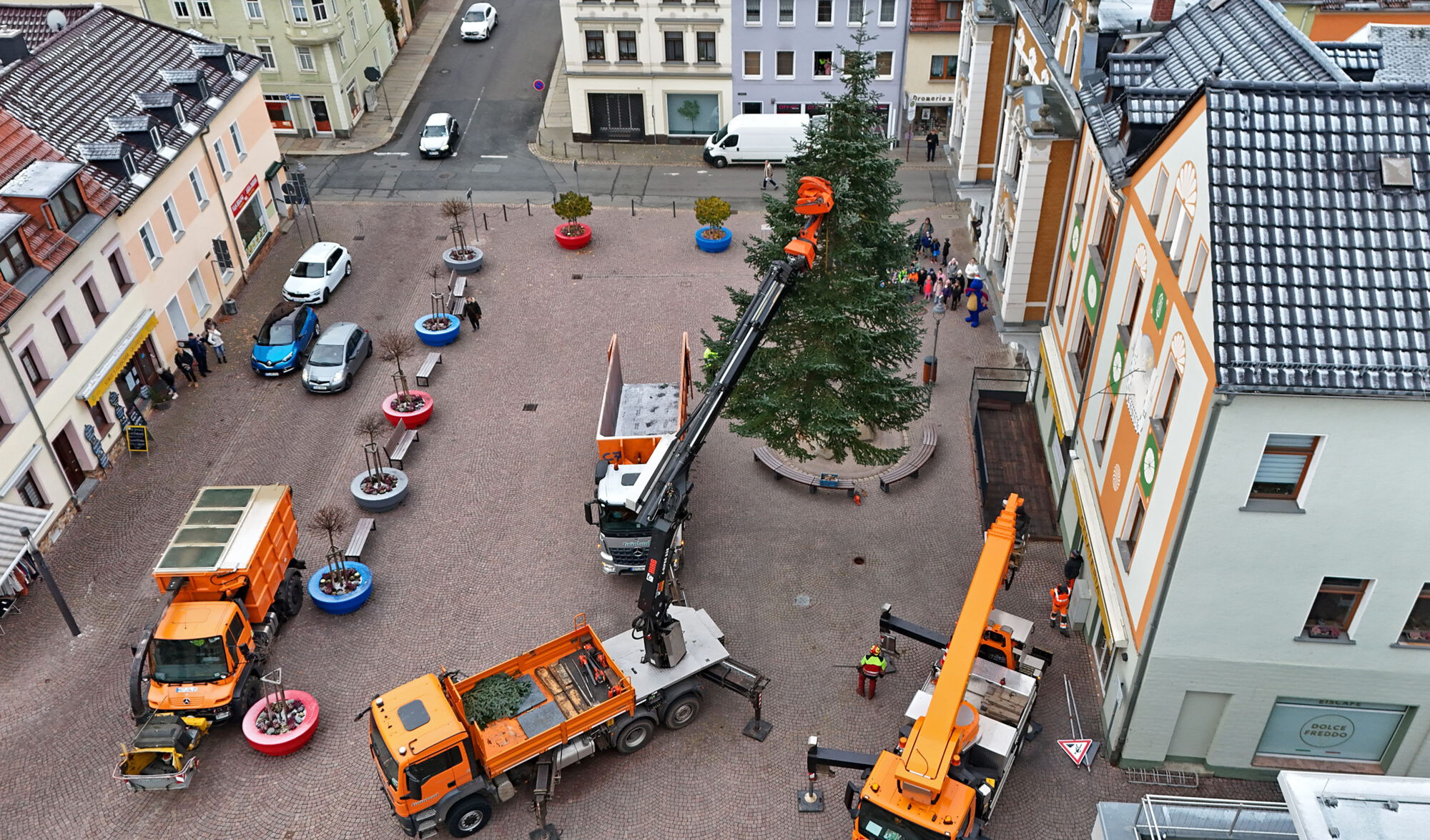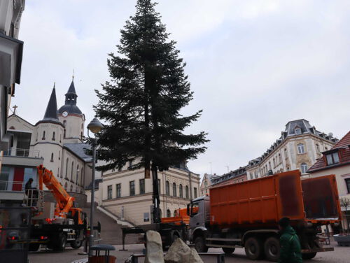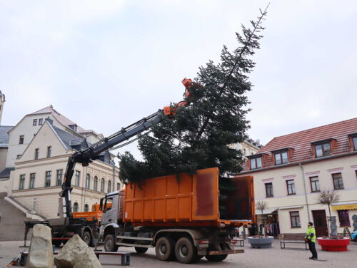 Wie Sabine Schumann, Dezernentin Bauwesen und Umwelt informiert, sind beide Bäume Spenden von Bürgern. Dafür ein herzliches Dankeschön an die Baumspender und ein ebenso großes Dankeschön an die Fa. Grünland GmbH, die die Fällung, den Transport und das Aufstellen des Baumes auf dem Teichplatz übernommen hat, und an die Mitarbeiter der Meeraner Stadttechnik für die Unterstützung und die Aufstellung des Baumes auf dem Markt.