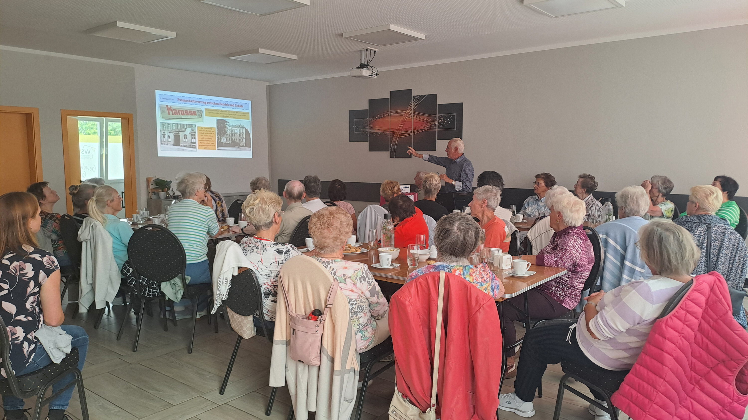 Der monatliche Seniorentreff im Westring wurde 2025 natürlich ebenfalls fortgesetzt. In den Räumlichkeiten „Zum Ringtreff“ fanden auch in diesem Jahr zahlreiche Veranstaltungen statt, von geselligem Kaffee-Klatsch über Mitmachangebote bis hin zu wertvollen Informations-Vorträgen. So bot das DRK Glauchau eine Schulung zum Thema „Erste Hilfe für Senioren“ an, die Polizeidirektion Zwickau informierte über „Betrugsfallen“. Medizinische Hilfsmittel für Senioren wie Hausnotruf-Angebote wurden vorgestellt, die Pflegeberatung informierte über wichtige Anträge und Anlaufstellen für Pflegebedürftige und Angehörige. Besonders begeistert waren die Senioren von Veranstaltungen zur Stadtgeschichte, die unter anderem in Zusammenarbeit mit den Meeraner Ortschronisten organisiert wurden. Ein weiteres Highlight war die Trabant-Rundfahrt zu den Schauplätzen der Automobilproduktion in Meerane, welche durch die Gruppe „Schlechte Gesellschaft“ ermöglicht wurde.