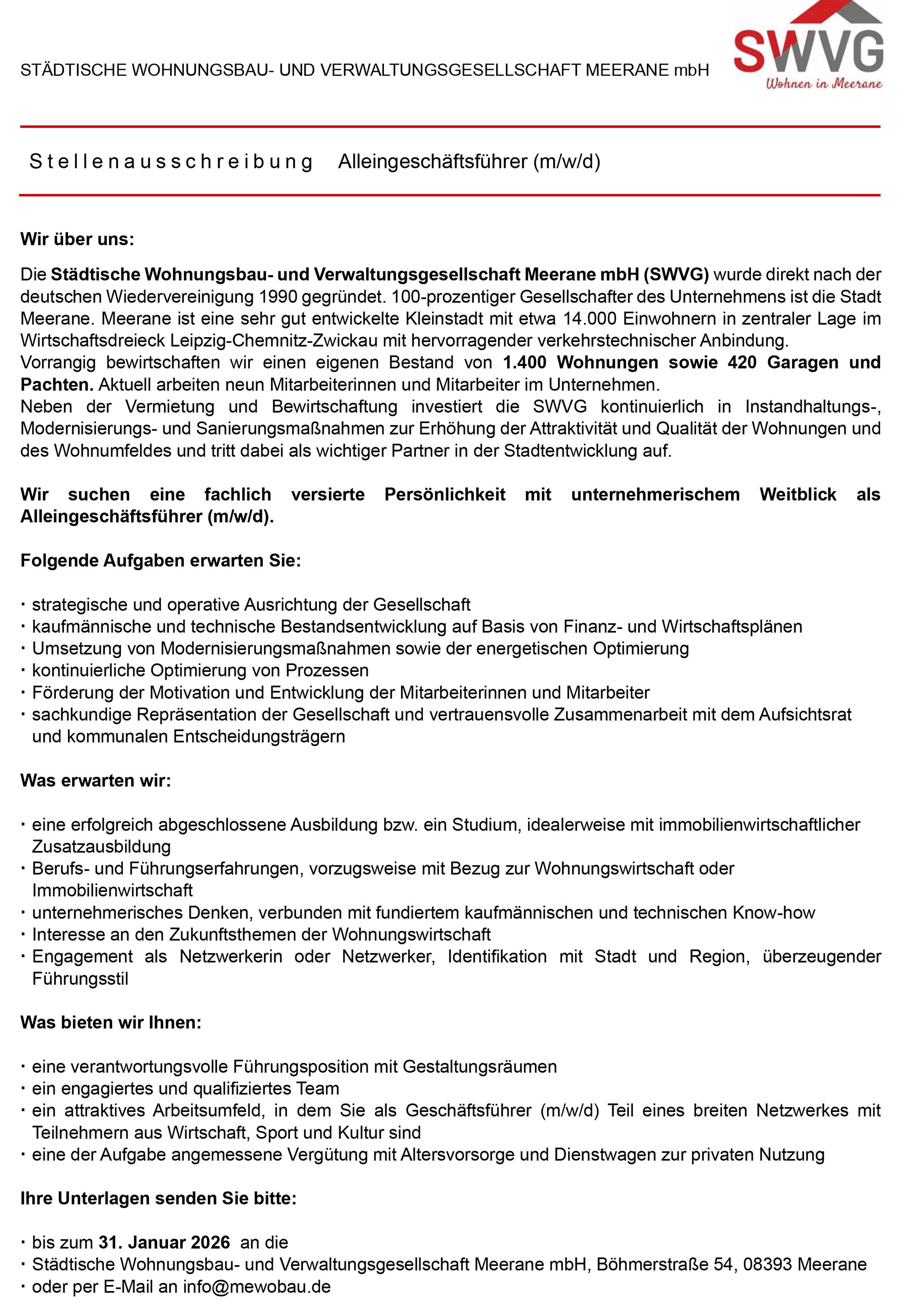 Stellenausschreibung SWVG Meerane: Alleingeschäftsführer (m/w/d)