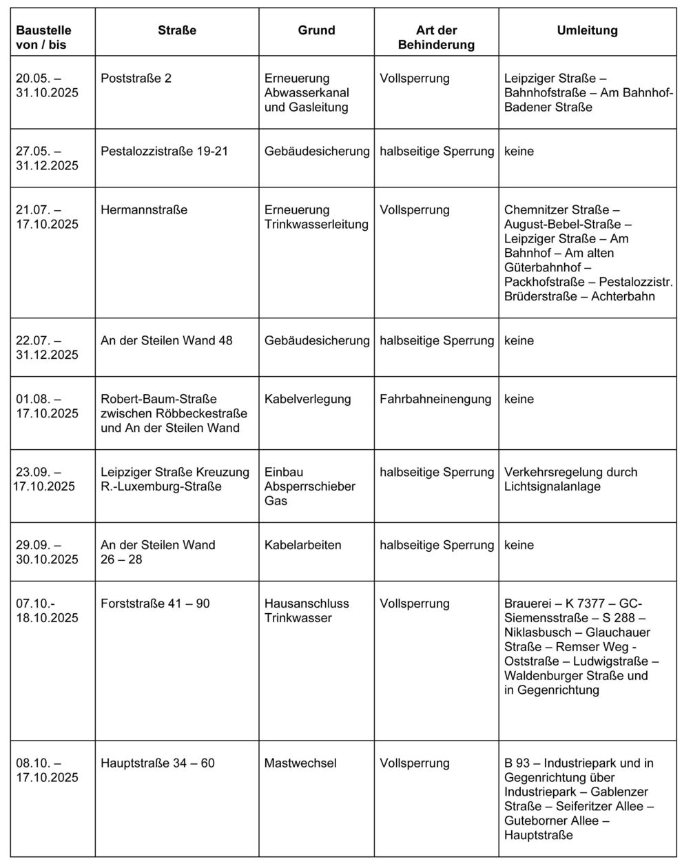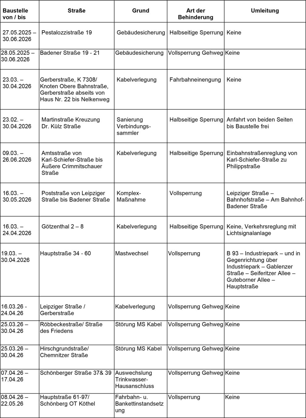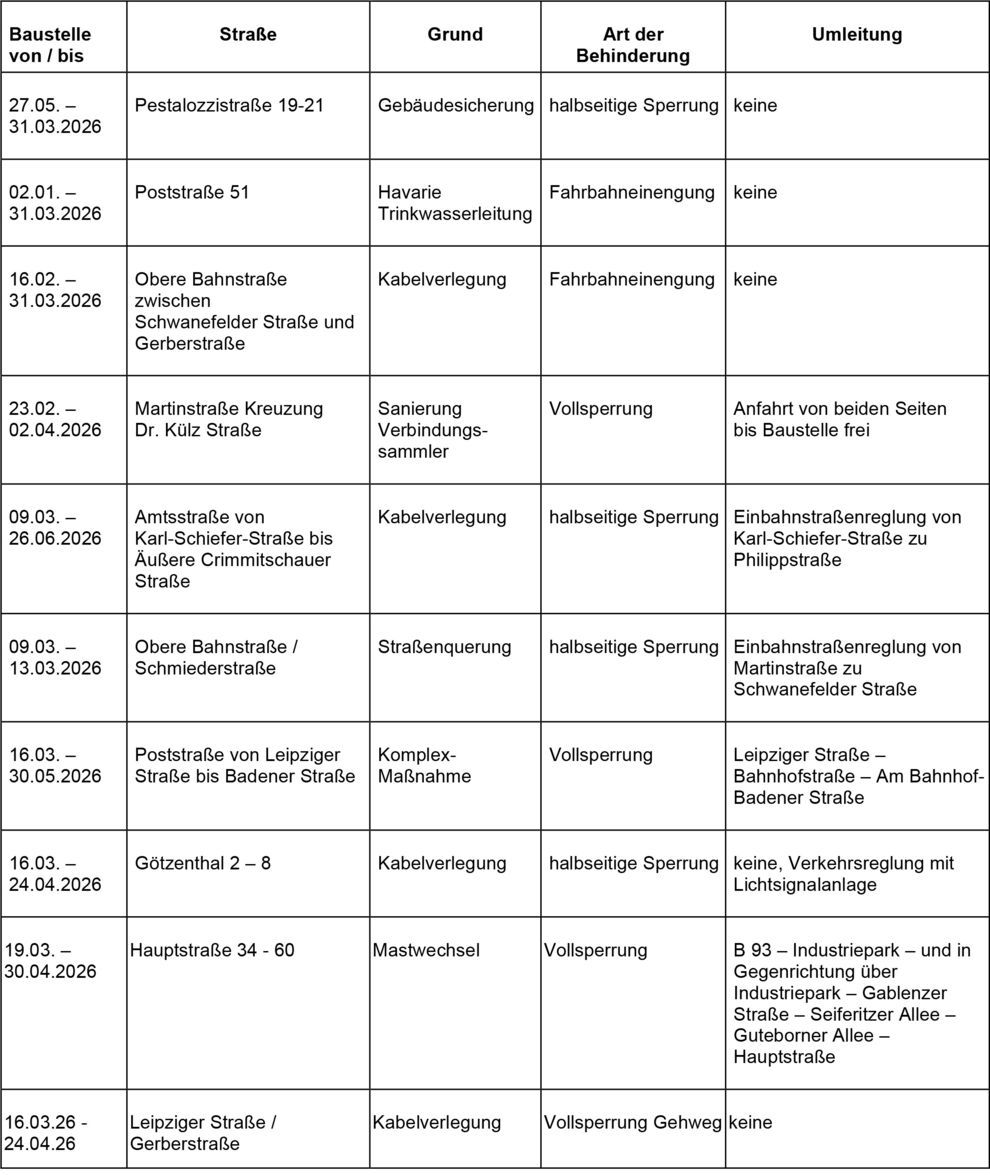 Dies ist eine voraussichtliche Information. Zeiträume für Beginn und Ende der Verkehrsbeschränkungen können sich jederzeit ändern. Alle Angaben ohne Gewähr.