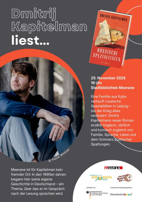 Am 25. November 2025 um 19:00 Uhr kommt Dmitrij Kapitelman mit seinem Roman „Russische Spezialitäten“ in die Stadtbibliothek Meerane. Die Partnerschaft für Demokratie lädt herzlich ein, dabei zu sein!