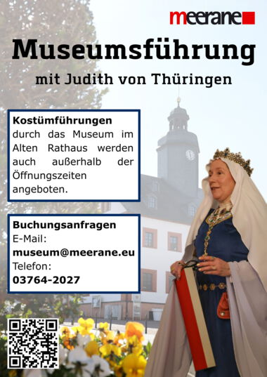 Am Samstag, den 18. April 2026, lädt das städtische Museum im Alten Rathaus um 15:00 und 16:00 Uhr zur Kostümführung ein. Kerstin Zienert wird die Gäste als „Judith von Thüringen“ durch die neue Dauerausstellung zur Stadtgeschichte geleiten.