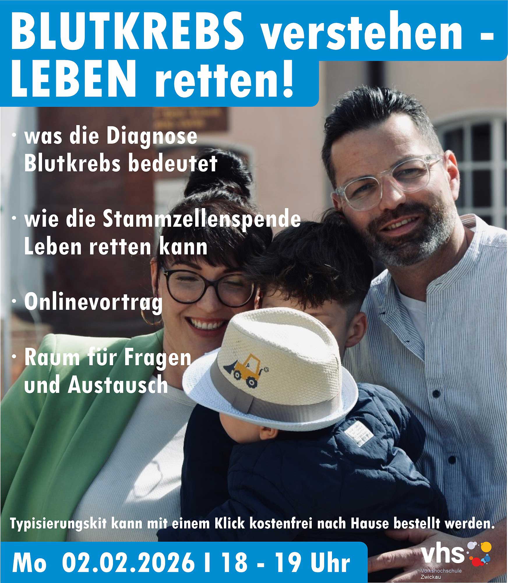 Der Onlinevortrag der Volkshochschule Zwickau erklärt verständlich, was hinter der Erkrankung steckt, wie eine Typisierung abläuft und warum jede Registrierung Hoffnung schenken kann. Im Anschluss gibt es Raum für Fragen und persönlichen Austausch. Außerdem kann online unkompliziert ein Typisierungskit bestellt werden.