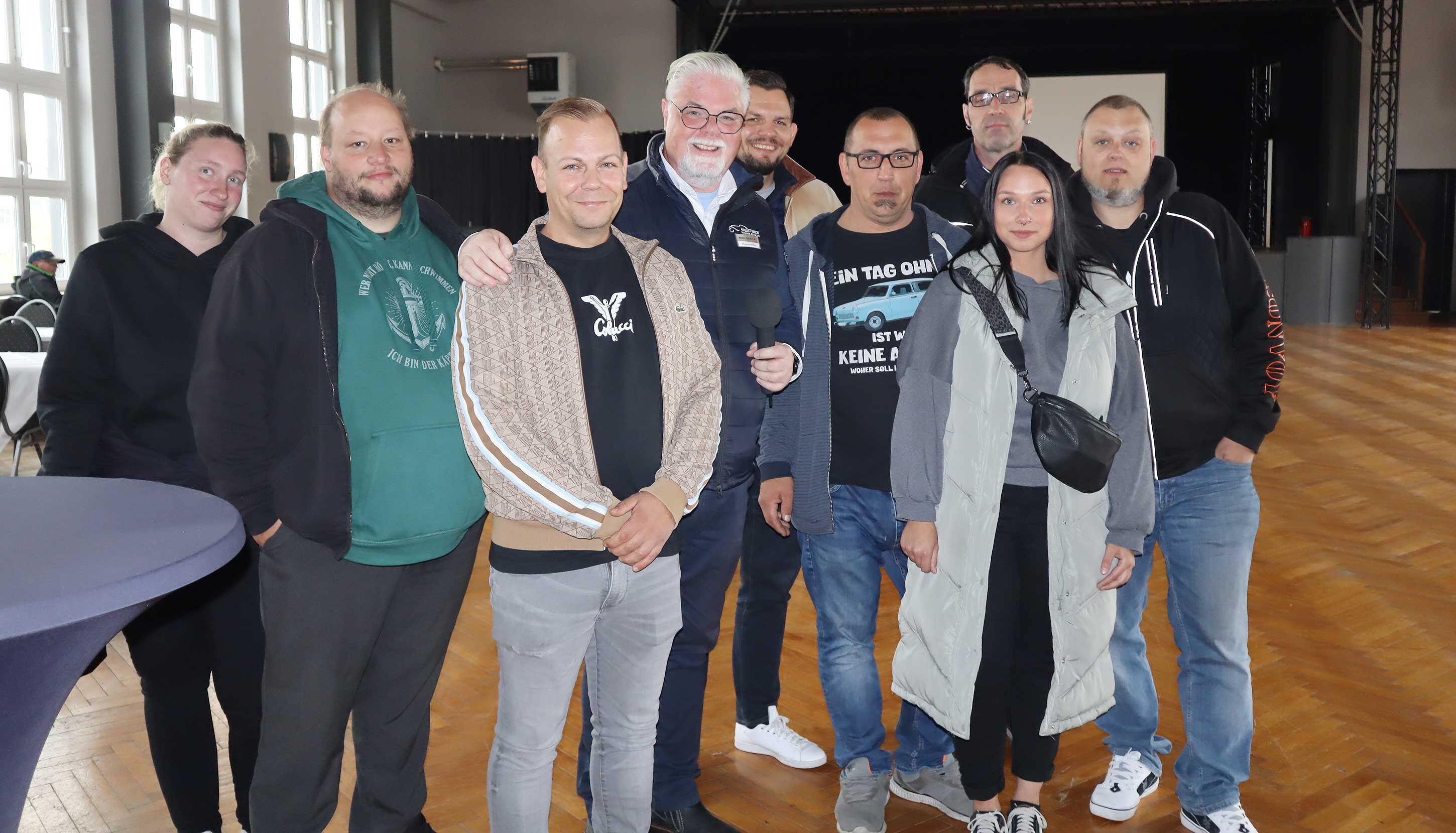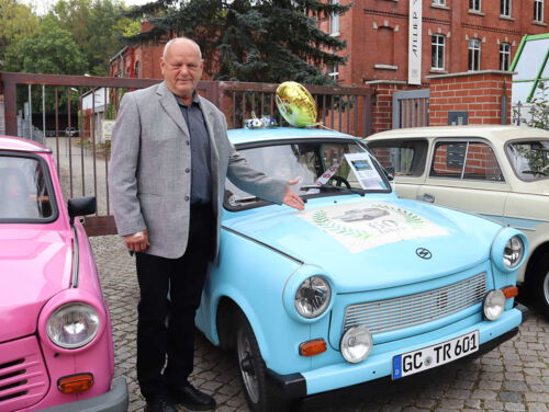 Thomas Müller vom Verein Inter Trab e.V. gemeinsam mit Trabant-Enthusiasten, die aus Berlin, Bitterfeld und Neuhaus nach Meerane angereist waren.