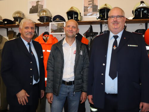 Auch Bürgermeister Jörg Schmeißer stattete der Ausstellung einen Besuch ab und erkundigte sich bei den Kameraden Frank Lenk und Jens Menge über die Ausstellung.