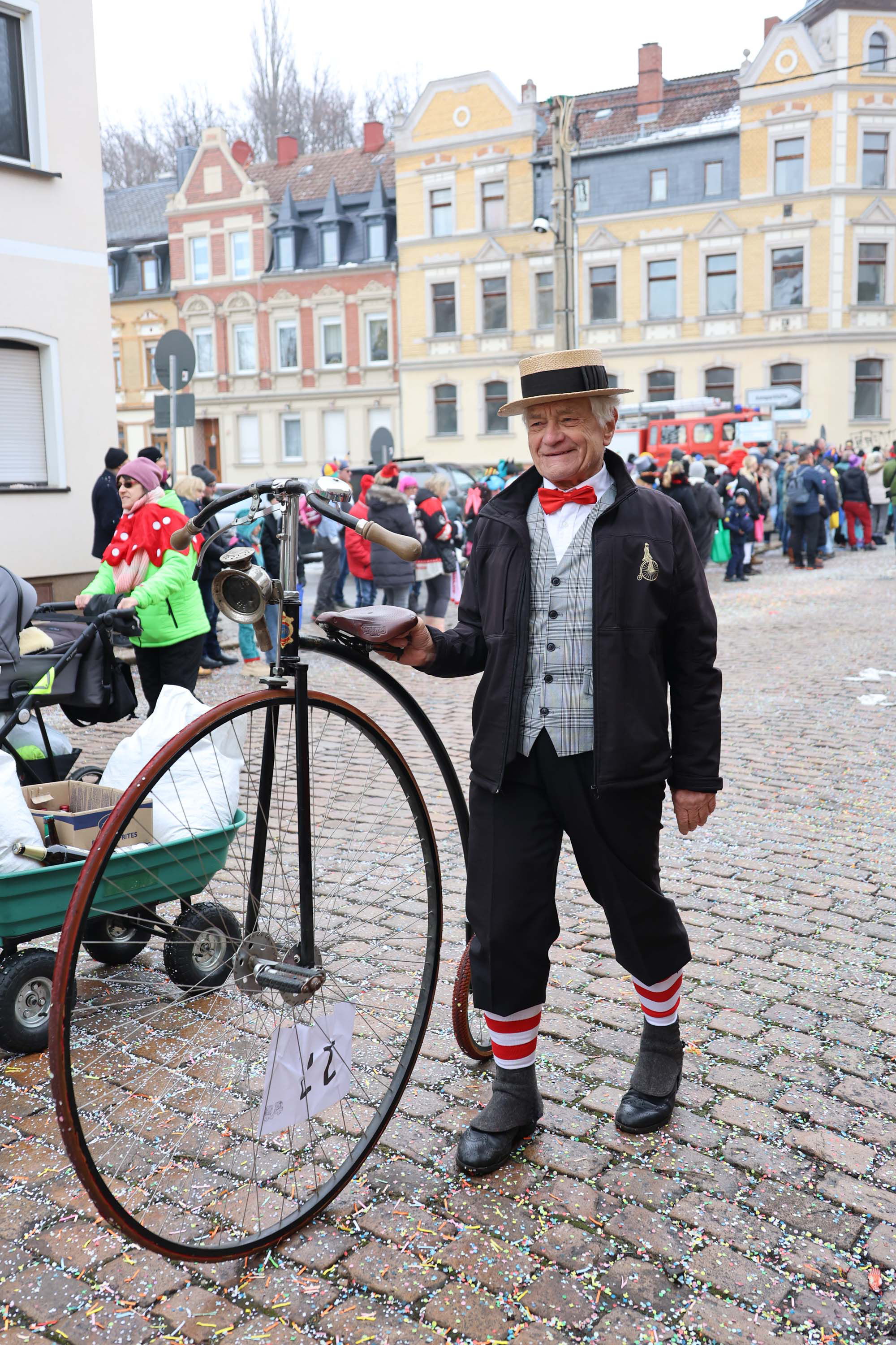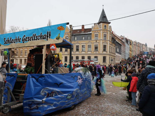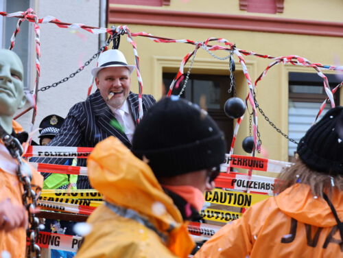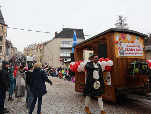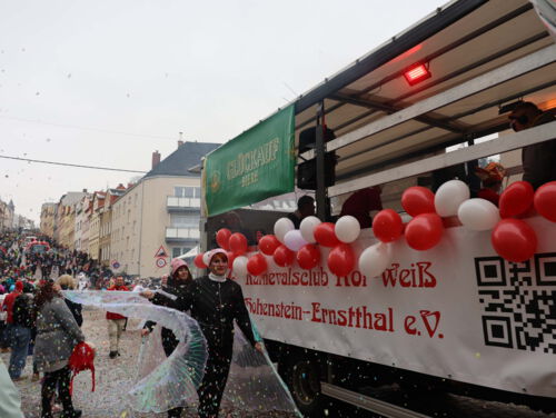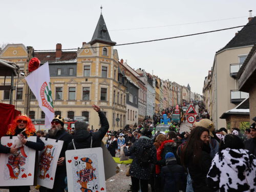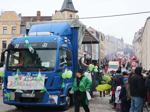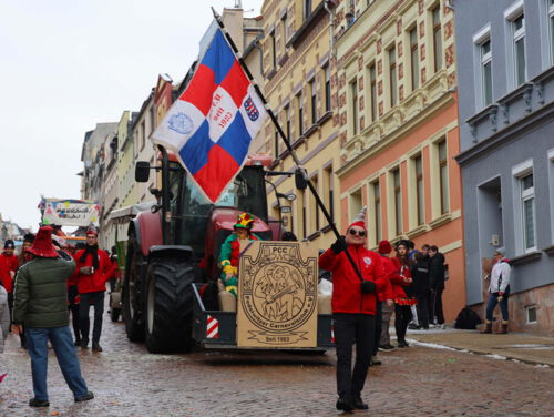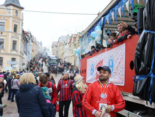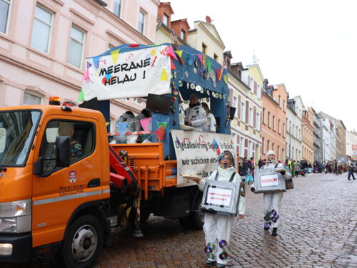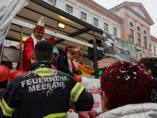 Mitten im Geschehen war auch Bürgermeister Jörg Schmeißer, der auf dem Umzugswagen der Stadt Meerane mitfuhr. Unter dem augenzwinkernden Motto „Digitalisierung Stück für Stück – wir schicken ein HELAU per Fax zurück!“ zeigte sich auch die Stadtverwaltung von ihrer närrischen Seite. Begeistert von der grandiosen Stimmung im Zug und entlang der Straßen dankte Jörg Schmeißer im Namen der Stadt Meerane allen Beteiligten – insbesondere den Organisatoren der Meeraner Pflasterköppe – herzlich für ihr großes Engagement.