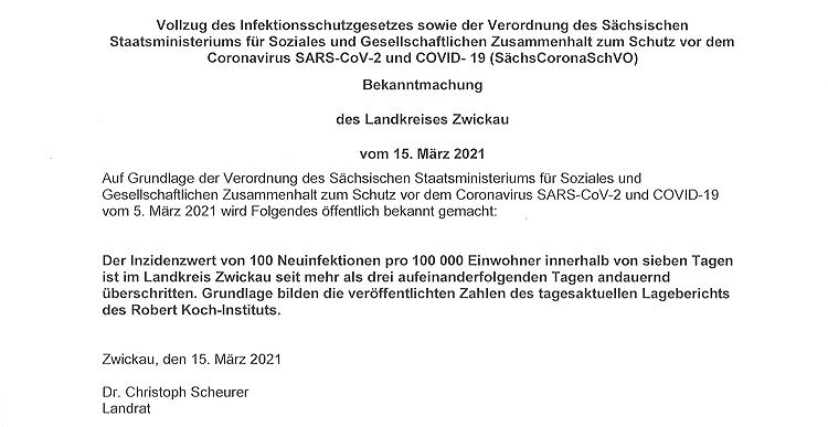 – Vollzug des Infektionsschutzgesetzes (lfSG) Aufhebung der Allgemeinverfügung des Landkreises Zwickau vom 8. März 2021 – Bekanntmachung des Landkreises Zwickau vom 15. März 2021 (Aufhebung Lockerung von Schutzmaßnahmen)...pdf-Dokument