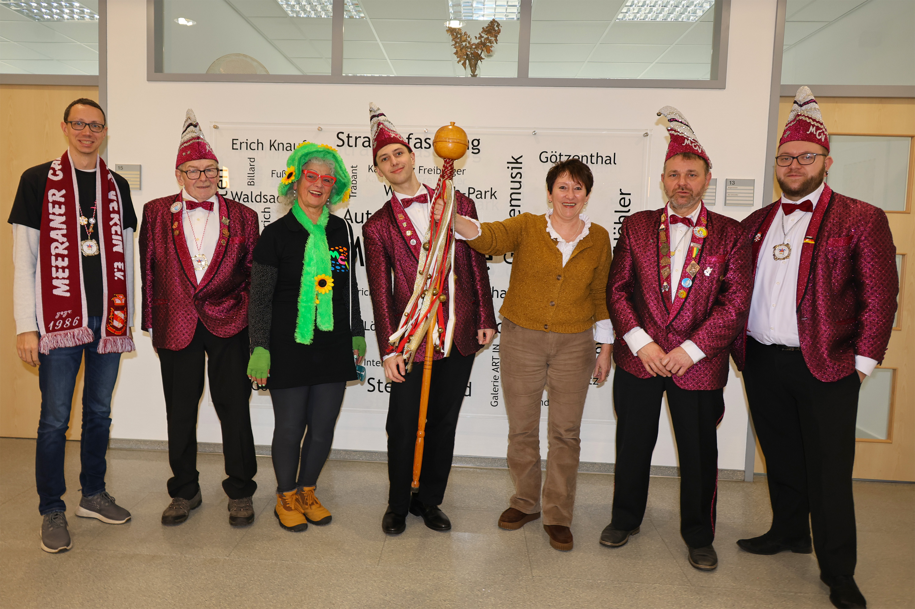 „Meerane Helau“ hieß es am heutigen Aschermittwoch in der Stadtverwaltung Meerane, als die Delegation des Meeraner Carnevals Vereins das Faschingszepter wieder ins Neue Rathaus brachte. Am 11.11.2025 hatten der MCV, die Meeraner Pflasterköppe, die Meeta-Girls und die Meeraner Nachtwächter das Zepter entgegengenommen und damit die Faschingszeit eingeläutet, die nun traditionell beendet wurde.