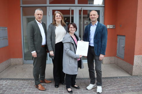 Am 18. März 2026 begrüßte Bürgermeister Jörg Schmeißer gemeinsam mit der Leiterin der Bibliothek Adriana Bellmann und Sindy Haller-Senjić, stellvertretende Dezernatsleiterin Finanzen und Liegenschaften, den Landrat des Landkreises Zwickau Carsten Michaelis in Meerane. Mit dabei hatte dieser den Zuwendungsbescheid für das Vorhaben und gute Wünsche für die Umsetzung: „Ich freue mich, der Stadt Meerane diesen Zuwendungsbescheid zu überbringen, und ich freue mich vor allem für die Nutzerinnen und Nutzer, die künftig leichter und barrierefreier die Stadtbibliothek erreichen können.“