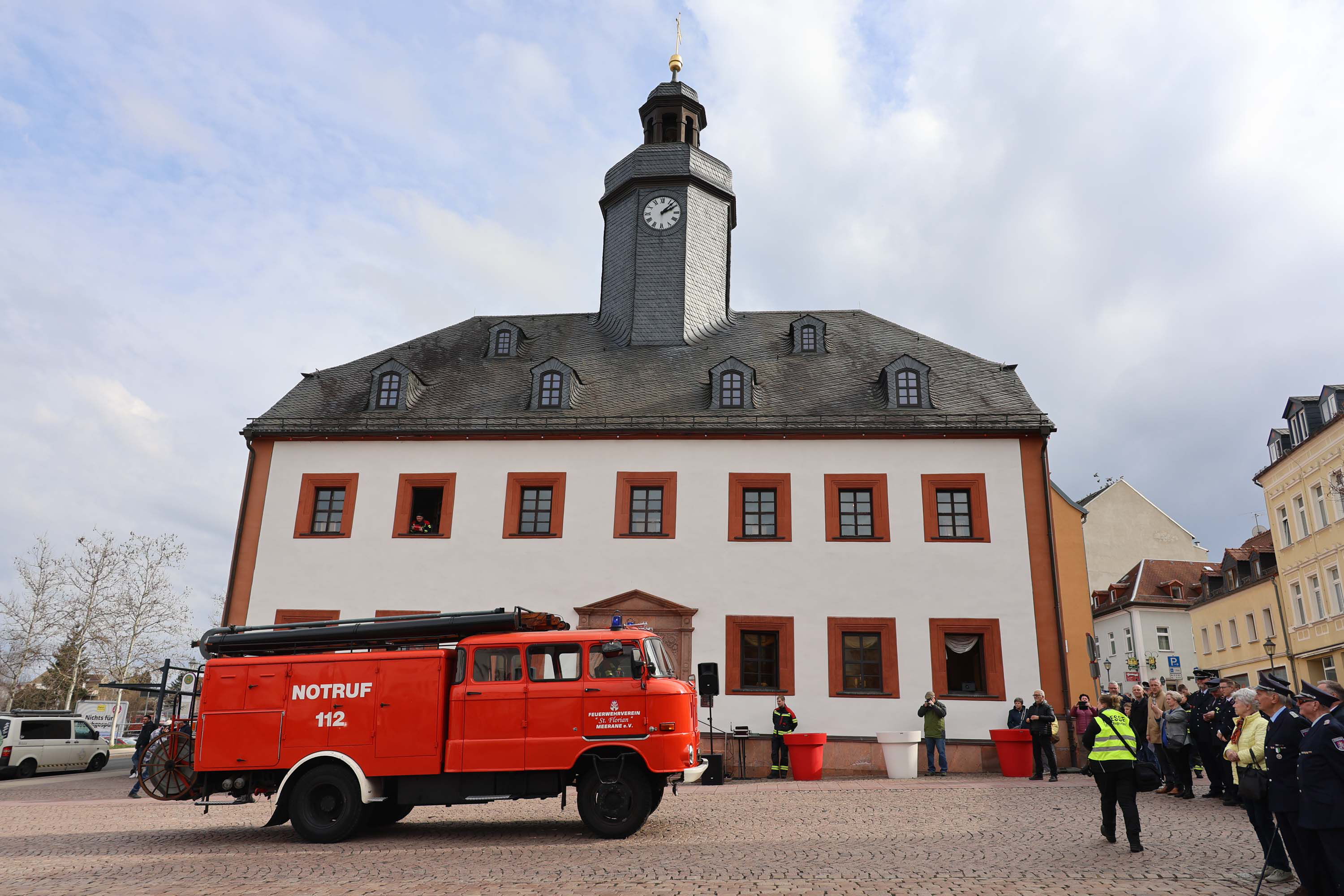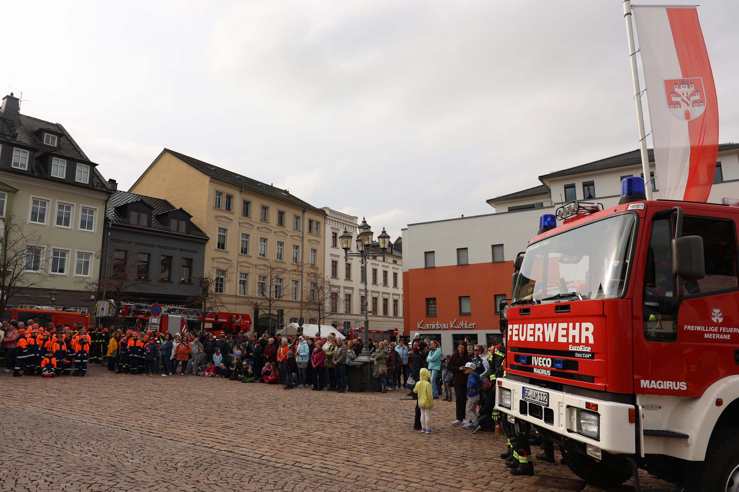 Wehrleiter Kai Götze hieß neben den vielen großen und kleinen Gästen auch Bürgermeister Jörg Schmeißer, Landrat Carsten Michaelis, die Landtagsabgeordnete Daniela Pfeifer, den Landtagsabgeordneten Andreas Gerold, Meeraner Stadträte, die Dezernentin Iris Anders sowie Wehrleiter und Kameraden aus den umliegenden Gemeinden herzlich willkommen. „Es ist eine besondere Veranstaltung“, betonte Kai Götze. Die letzte Fahrzeugvorstellung dieser Art auf dem Meeraner Markt hatte im September 1979 stattgefunden. „Es war damals die erste Fahrzeugübergabe, die ich miterlebt habe“, erinnerte sich der Wehrleiter. Die Freude ist groß, dass so viele Gäste den Weg auf den Markt gefunden haben. „Wir wollen zeigen, wofür die Stadt Meerane Geld investiert – für die Sicherheit der Einwohner.“