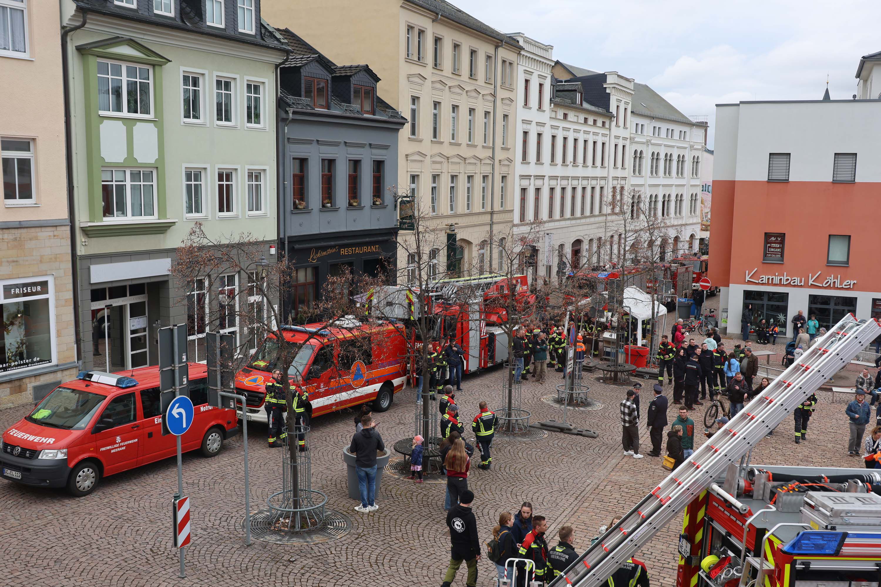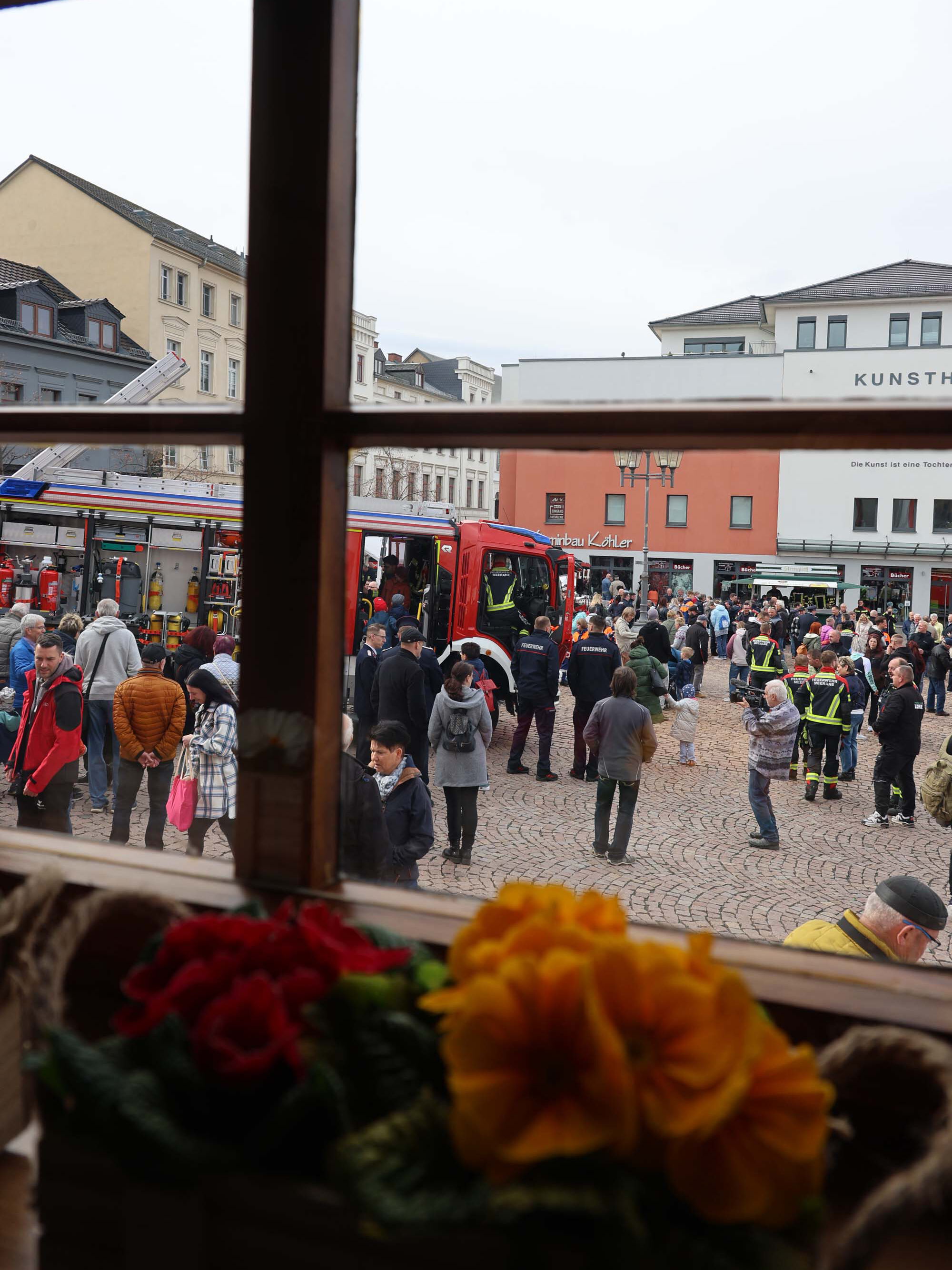 Anschließend war es soweit: Das neue HLF 20 rollte zur Schauübung auf den Markt. Simuliert wurde eine Brandbekämpfung am Alten Rathaus. Während Kai Götze die technischen Details und die umfangreiche Ausstattung des Fahrzeugs erläuterte, begannen die Kameraden mit den Vorbereitungen für den Einsatz und brachten die benötigten Geräte in Stellung. „Das HLF 20 hat eine Vielzahl von Gerätschaften an Bord und ist für nahezu alle Einsatzlagen gerüstet“, erklärte der Wehrleiter.
