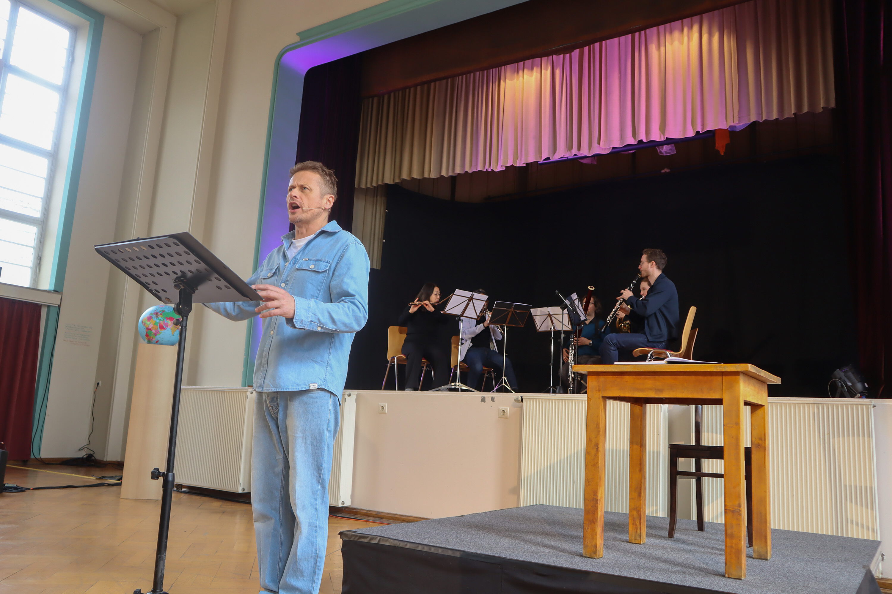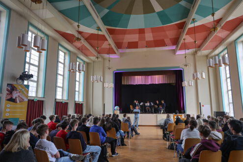 Das Ensemble „OPUS 45“ mit Schauspieler Roman Knižka war am 27. März 2026 wieder zu Gast in Meerane – diesmal für eine außergewöhnliche Sondervorstellung für Meeraner Schülerinnen und Schüler. Eingeladen zur musikalischen Lesung hatte erneut die Partnerschaft für Demokratie Meerane, deren Koordinatorin Juliane Richter die Schülerinnen und Schüler der 8. Klassen der Tännichtschule und der Internationalen Oberschule Meerane sowie der 9. Klasse der Goetheschule zur besonderen Geschichtsstunde im Kirchgemeindehaus begrüßte.
