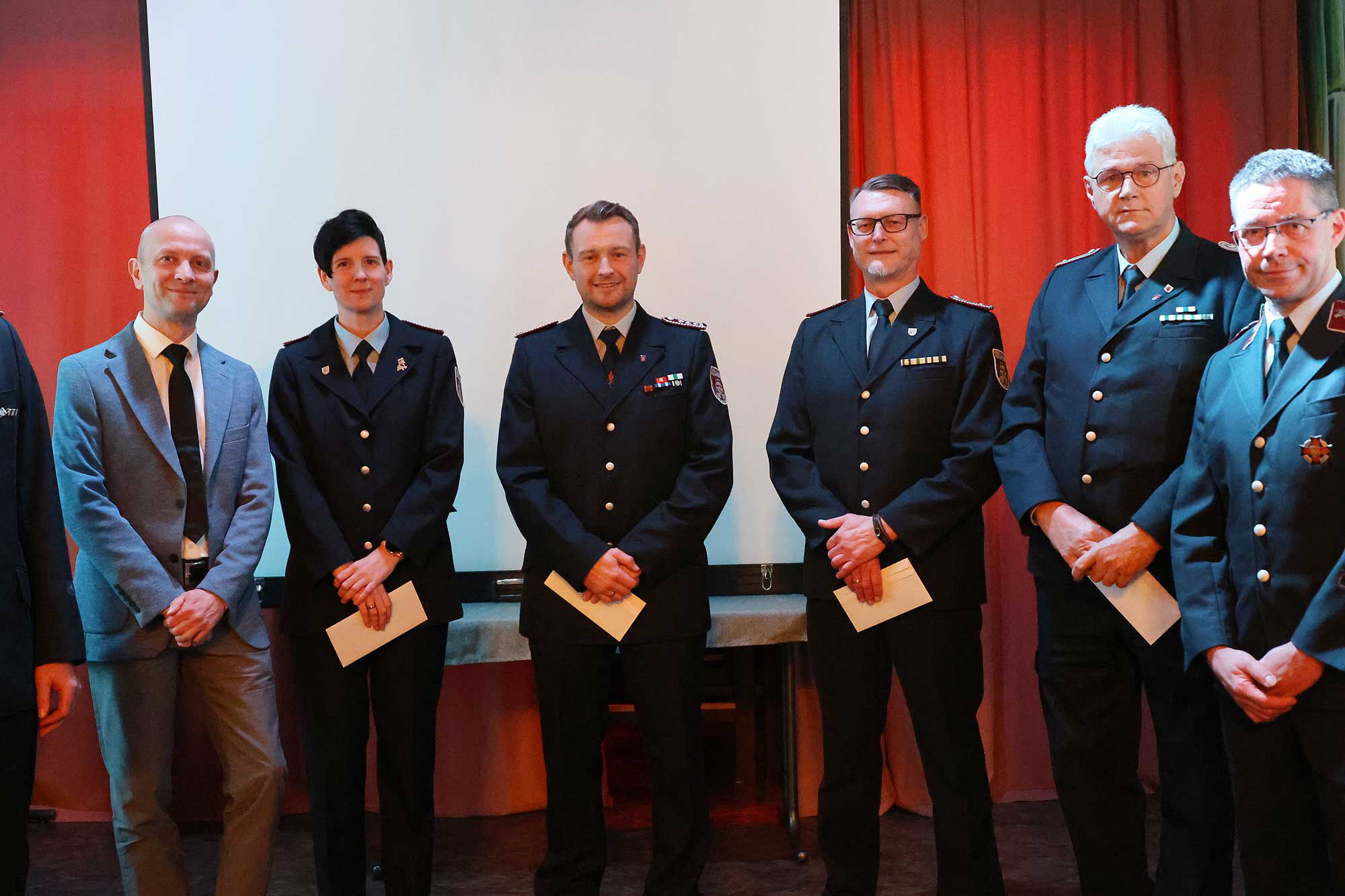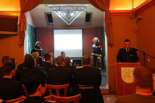 Ein großes Dankeschön richtete der Wehrleiter abschließend an alle Akteure, die den „mittelständischen Handwerksbetrieb Feuerwehr am Laufen halten“: an die Kameradinnen und Kameraden, die sich um Reparatur, Wartung, Ausrüstung, Ausbildung etc. kümmern, die Projektgruppe HLF 20 und den Fachausschuss Bekleidung, die Zugführer der Löschzüge und ihre Stellvertreter und den Leiter der Ehrenabteilung. „Ich bedanke mich recht herzlich für die von euch erbrachten Leistungen bei den 155 Einsätzen, bei den verschiedensten Ausbildungen, bei der Technikpflege oder Reinigungsdiensten zur Säuberung von Fahrzeugen, Werkstätten und der Fahrzeughalle. Ohne dieses gemeinsame Wirken würde eine freiwillige Feuerwehr nicht funktionieren“, sagte er.