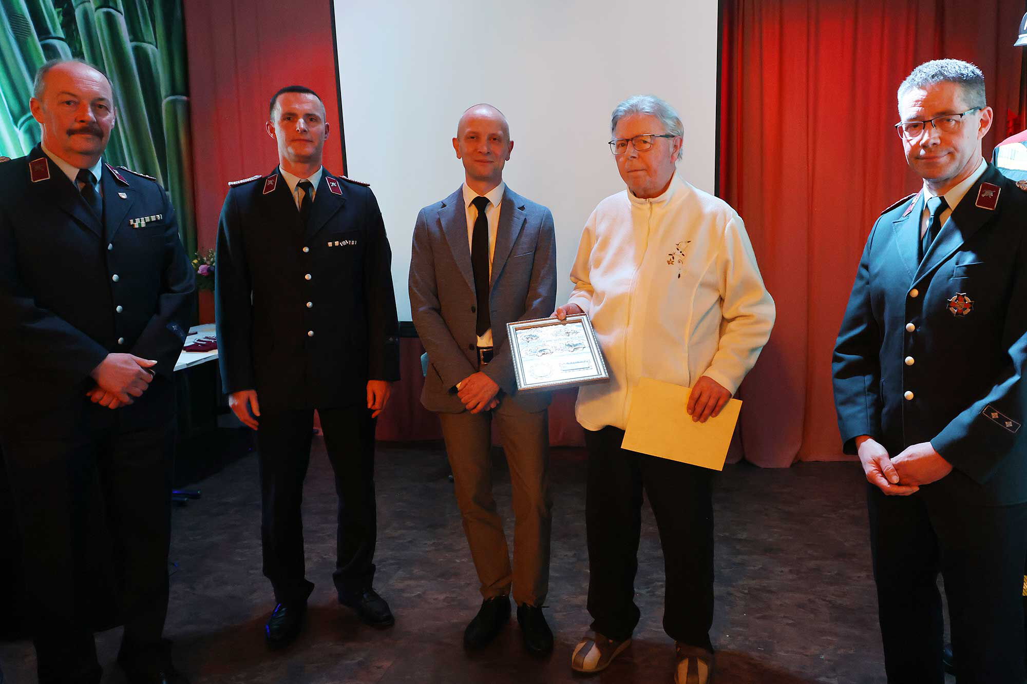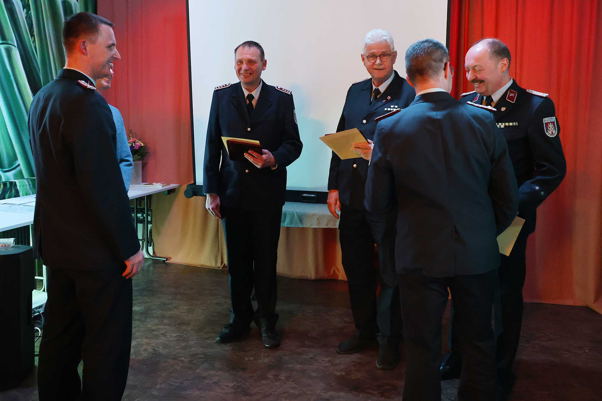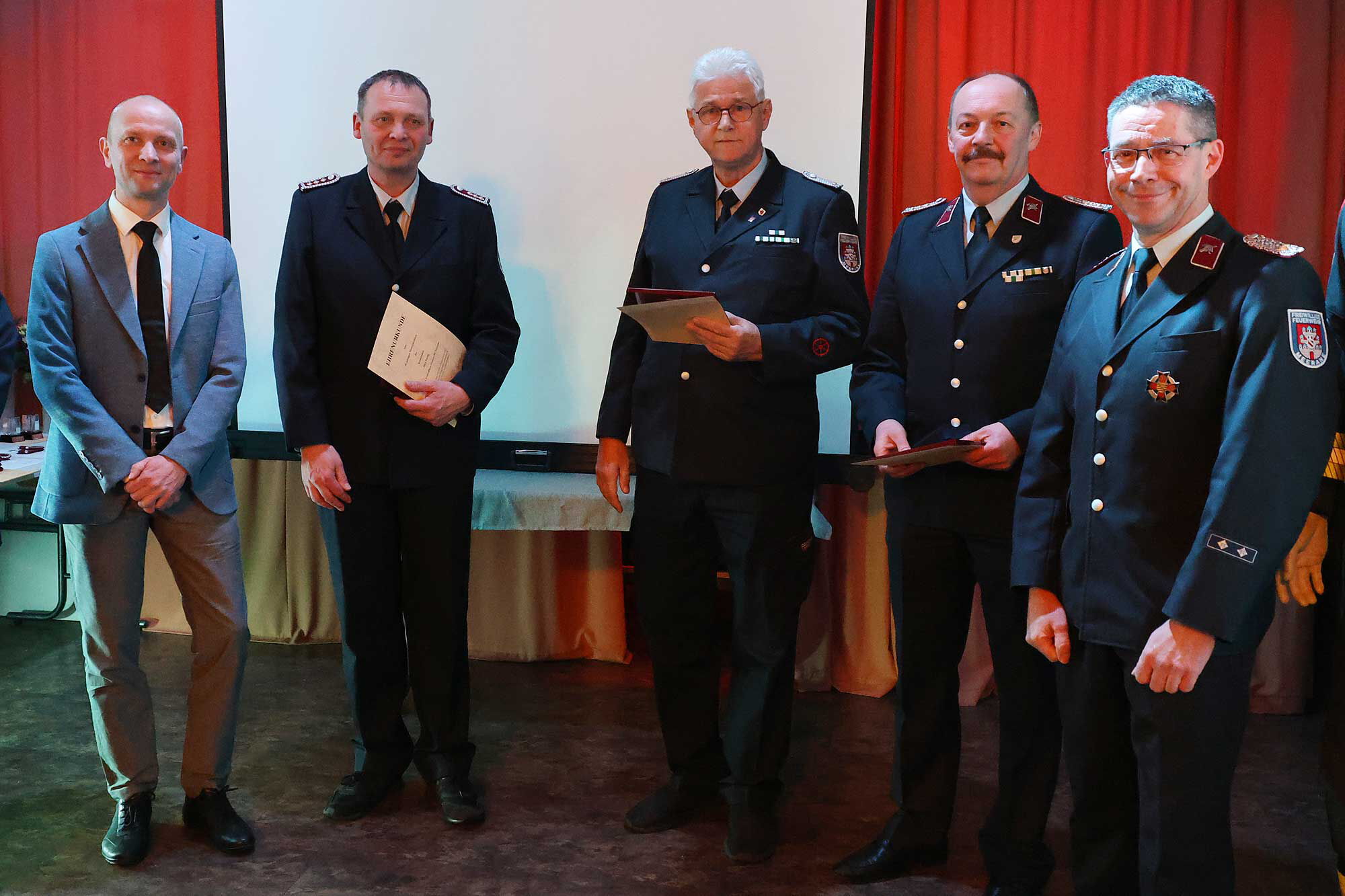Die Urkunden überreichten Wehrleiter Kai Götze und seine Stellvertreter Jörg Scheerer und Sven Hertwig gemeinsam mit Bürgermeister Jörg Schmeißer, verbunden mit herzlichen Glückwünschen.