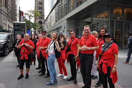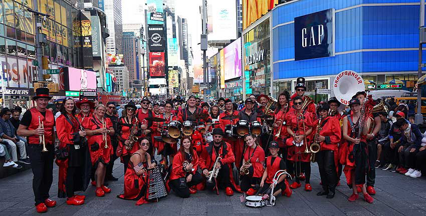 Die Meeraner Draufgänger-Guggis sind zur diesjährigen Steubenparade nach New York City gereist. Ob beim Empfang des New Yorker Bürgermeisters, am Times Square oder in den Straßen von Manhattan: Mit ihrer Vereinskleidung sind die Draufgänger-Guggis aufgefallen und wurden immer wieder angesprochen, mit durchweg positiven Erlebnissen. Fotos: Draufgänger-Guggis e.V.