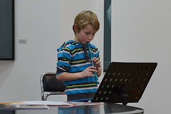 Die Einführung in die Ausstellung übernahmen Mira, Marie und Jun, die dem Publikum Wissenswertes aus dem Leben des Künstlers und über sein künstlerisches Arbeiten berichteten. Die musikalische Umrahmung gestalteten Simon (Cello), Mira (Klavier) und Willi (Flöte) sowie zwei Lehrerinnen der Schule.
