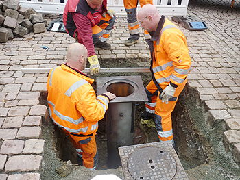 Einbau der neuen Baumhülse - gesponsert von der Meeraner Dampfkesselbau GmbH - auf dem Meeraner Markt am 12. April 2017.