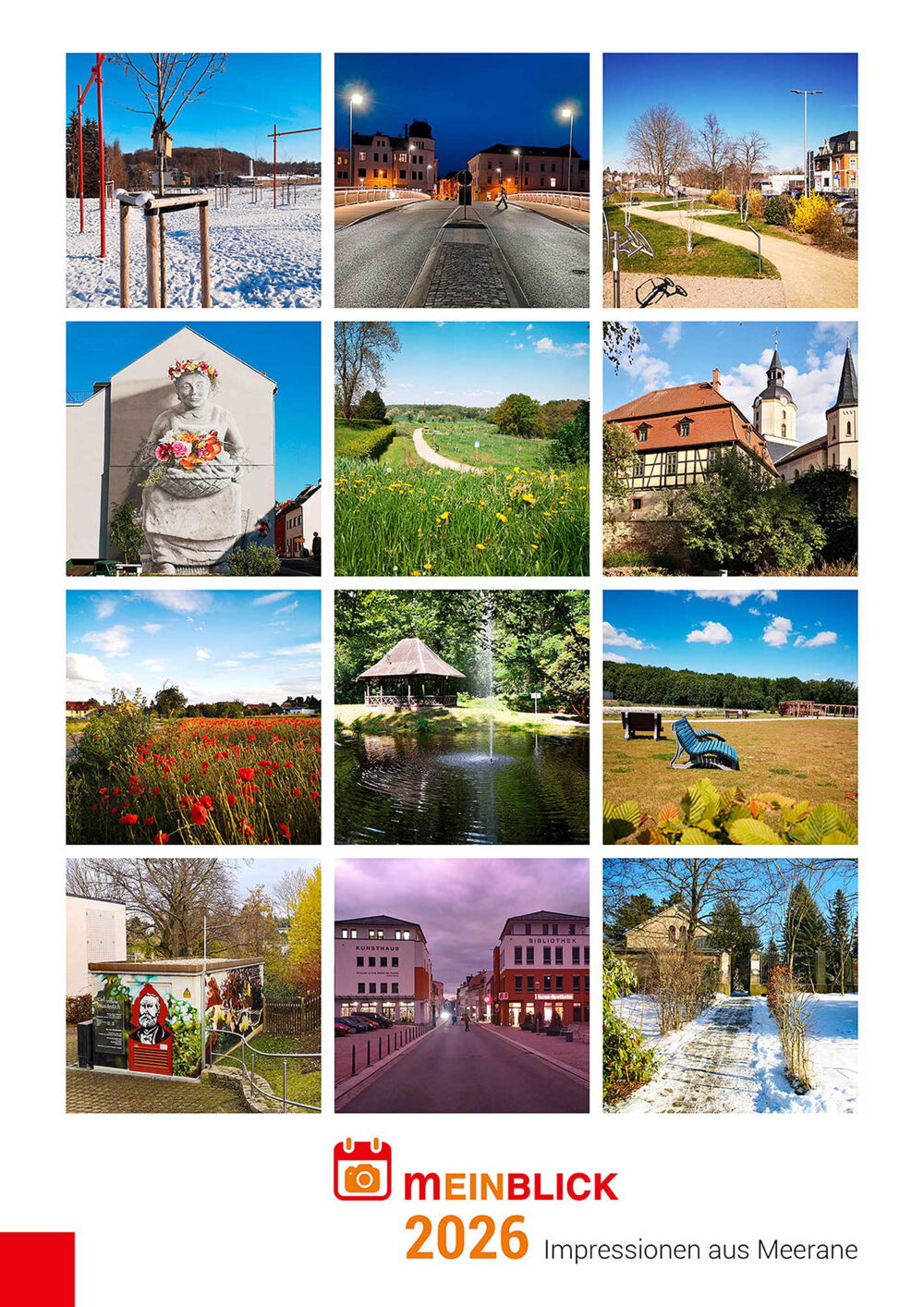 Unter dem Motto mEINBLICK – Impressionen aus Meerane – bietet die Druckerei Zschiesche auch für 2026 wieder einen Meeraner Kalender an. Die Kalenderblätter zeigen Impressionen und Stadtansichten im Lauf der Jahreszeiten, darunter der Stadtgarten an der Augasse, der Ententeich im Wilhelm-Wunderlich-Park oder der neugestaltet Bereich des Wunderlich-Parkes an der Äußeren Crimmitschauer Straße.