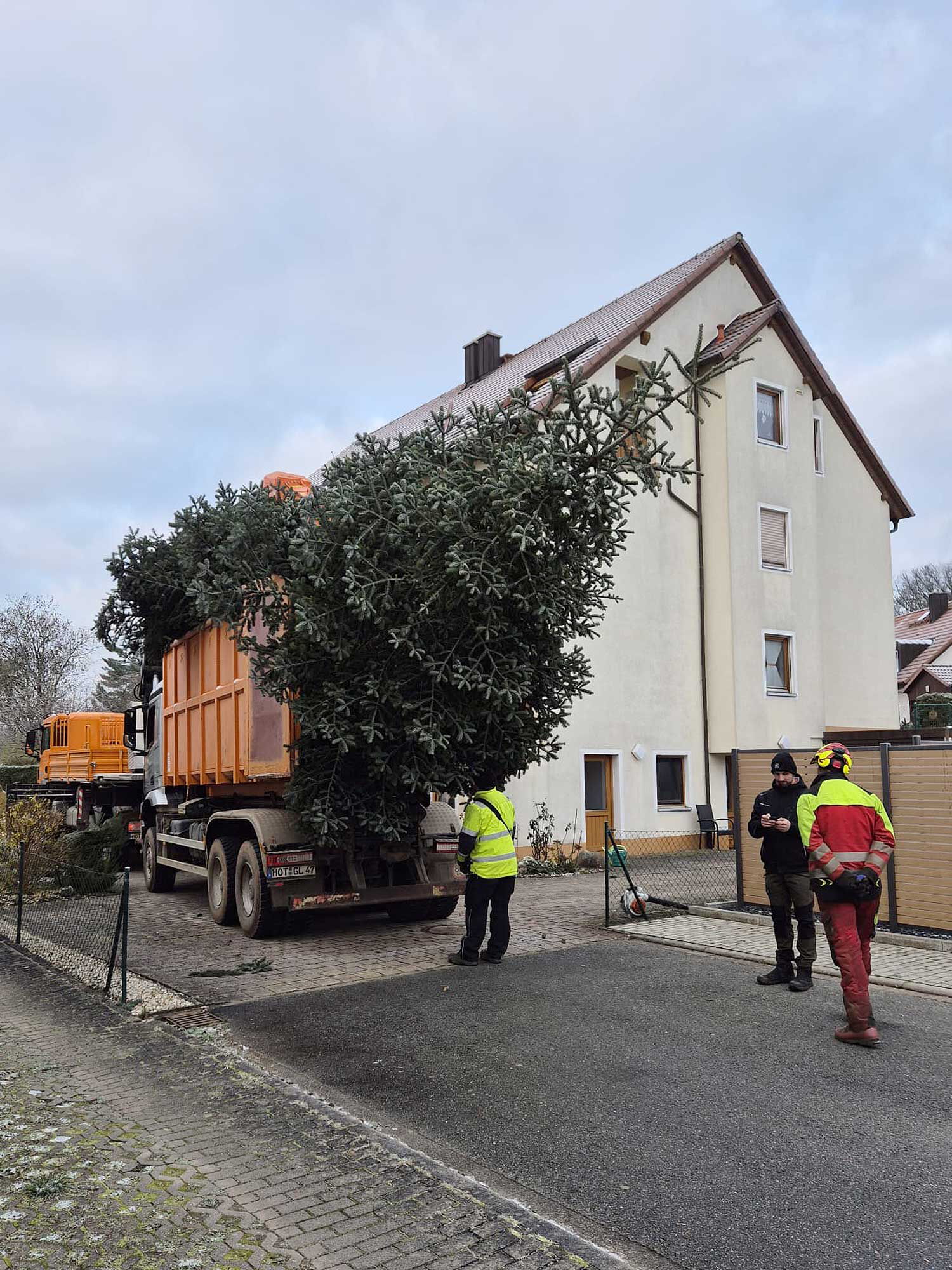 Die rund zehn Meter große Nordmanntanne, die nun in der Advents- und Weihnachtszeit unseren Teichplatz schmückt, war heute Morgen auf einem Grundstück am Meeraner Ulmenweg gefällt worden. Bereits gestern wurde der Weihnachtsbaum für den Markt in Schönberg abgeholt und aufgestellt.