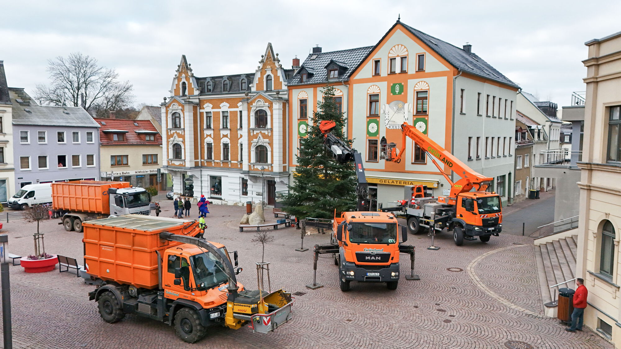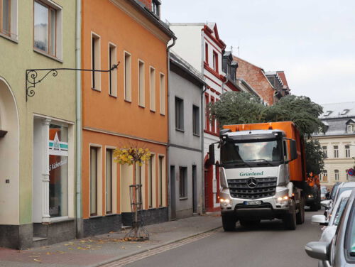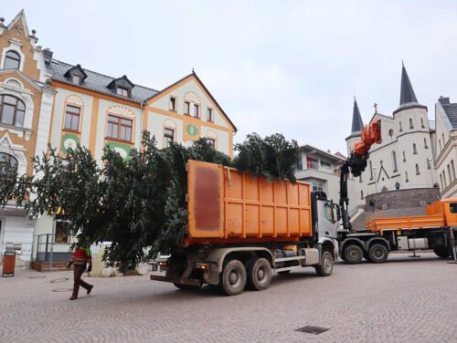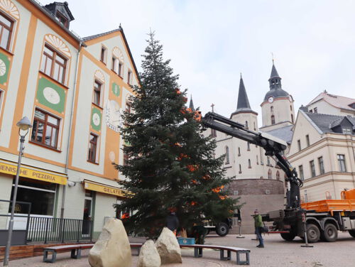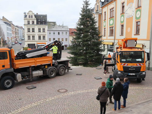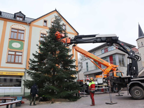 Wie Sabine Schumann, Dezernentin Bauwesen und Umwelt informiert, sind beide Bäume Spenden von Bürgern. Dafür ein herzliches Dankeschön an die Baumspender und ein ebenso großes Dankeschön an die Fa. Grünland GmbH, die die Fällung, den Transport und das Aufstellen des Baumes auf dem Teichplatz übernommen hat, und an die Mitarbeiter der Meeraner Stadttechnik für die Unterstützung und die Aufstellung des Baumes auf dem Markt.