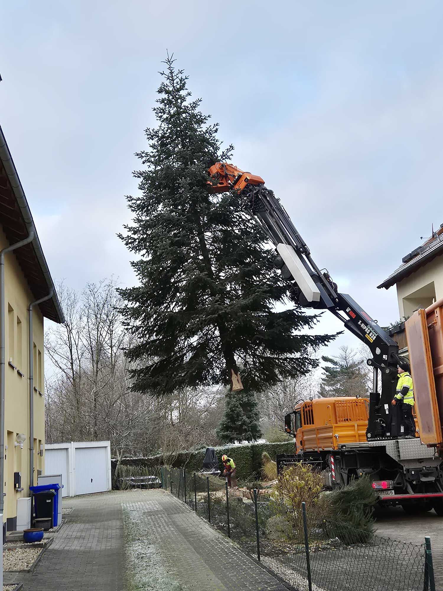 Meerano und die Kinder machten große Augen, als der Lkw mit Abrollcontainer von der Poststraße auf den Teichplatz einbog und der Baum dann mit einem Spezialfällkran vom Lkw gehoben wurde. Im Einsatz war außerdem eine ebenso beeindruckende Teleskophubarbeitsbühne. Auch Bürgermeister Jörg Schmeißer kam am Teichplatz vorbei und verfolgte das Spektakel.