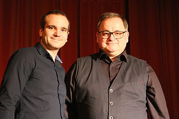 Michael Trischan (re.) und Simon Münzmay präsentierten am 15. Dezember 2017 "Bald ist schon wieder O-STERN", eine literarisch-musikalische Veranstaltung, in der Meeraner Stadthalle.