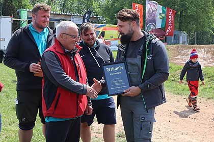 Tom Müller ist über seinen Bruder Christopher, der beim MC Meerane fährt, zum Verein gekommen. Der junge Mann, der in der Lukaswerkstatt in Cainsdorf arbeitet, unterstützt den Verein bei Marketing-Aktivitäten. Er hat Flyer, Plakate und die Sponsorentafel erstellt und Plakate für den Renntag verteilt. "Unentgeltlich und mit viel Kraft hat er sich für unseren Verein und für das heutige Rennen engagiert", sagte Danilo Geidel.
