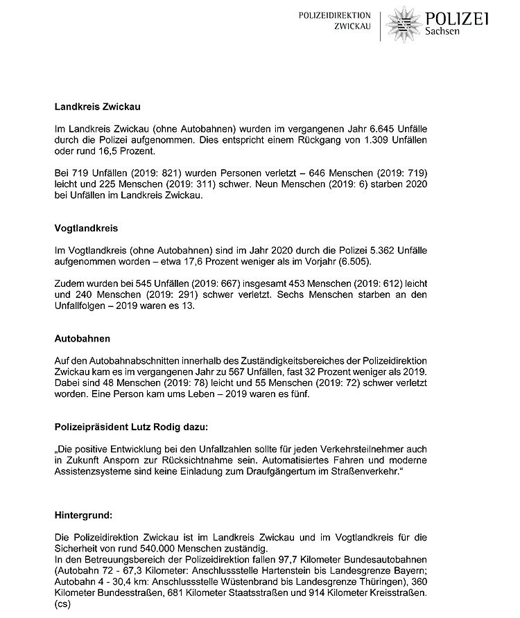 Verkehrsbericht 2020 der Polizeidirektion Zwickau