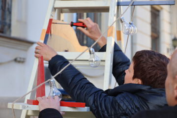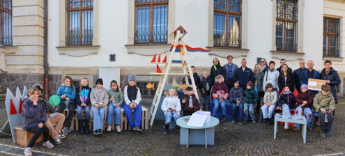 Anschließend war es Zeit, gemeinsam das Kunstwerk in Augenschein zu nehmen. Doch ganz fertig war das Werk noch nicht! Ein letztes Element, die Wetterfahne, fehlte noch. Deren symbolische Anbringung nahmen Franziska Kunz und Bürgermeister Jörg Schmeißer gemeinsam vor und vollendeten das Kunstwerk, welches nun vor der Neobarocken Post zum Verweilen einlädt. Es stellt einen Ort in der Meeraner Innenstadt dar, der von Bürgerinnen und Bürgern aktiv genutzt werden soll. Es ist Kunst, die nicht nur zum Anschauen und Bestaunen, sondern zum Benutzen gemacht ist! Die märchenhafte Geschichte zu dieser außergewöhnlichen Sitzgruppe, welche die Kinder zum Beginn der Feierstunde vortrugen, kann auch nachgelesen werden! Die Erzählung rund um den König und die Meerjungfrau ist in einem großen Buch aus Holz mit tollen Illustrationen zu lesen, welches Bestandteil des Kunstobjektes ist.