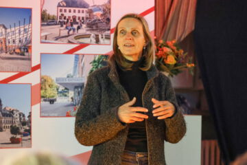 Durch die Feierstunde führte Alexander Fischer und stellte die Gedanken hinter dem Konzept „INTER – Zwischenhalte“ vor. Darin geht es darum, nicht die großen, markanten Bauwerke oder Denkmale ins Zentrum zu rücken, sondern die kleinen Zwischenhalte – Orte und Momente, die Menschen nachhaltig prägen – zu fokussieren und wirken zu lassen. Diese kleinen Stationen der Stadt sollen sichtbar gemacht und erlebbar gestaltet werden. Mit den drei Säulen Interaktion, Installation und Intervention entsteht eine dynamische Verbindung zwischen Geschichte, Gegenwart und Zukunft der Stadt. Wie Alexander Fischer erläuterte, bedeutet Interaktion, dass die „Station“ zum Anfassen anregen und zur Förderung von Diskurs und Austausch beitragen soll. Die zweite Säule, die Installation, verlangt, dass die „Station“ erschaffen wird, um einen Nutzen für Innenstadtbelebung zu haben und dabei vorhandene Gebäude und Materialien aufgreift. Als letzte Säule stellte Alexander Fischer die Intervention vor, die eine Störung oder einen ungewohnten Impuls beschreibt, der zum Nachdenken anregen soll.